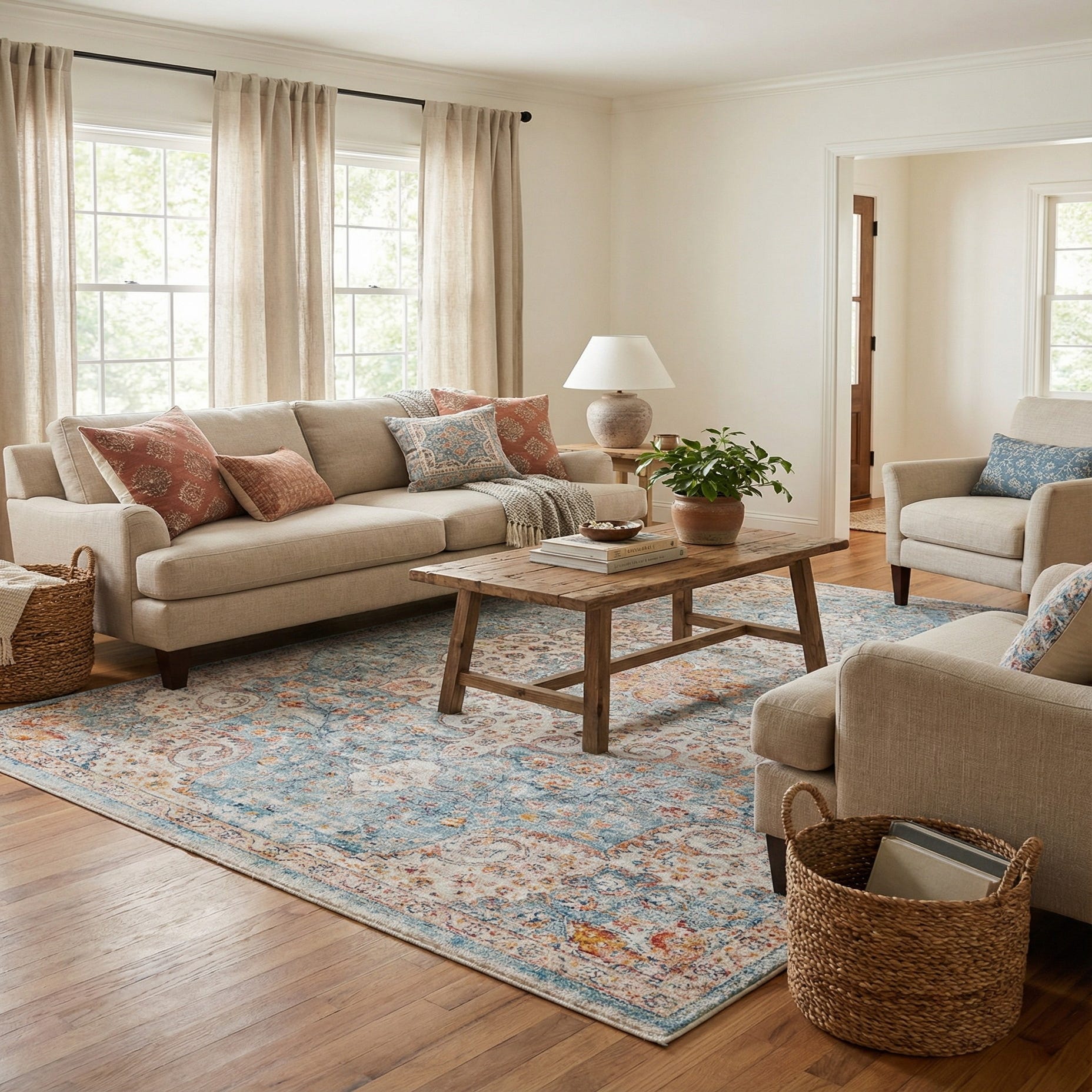 Primary color is Blue. Colors in this rug include: Blue, Ivory, Light Blue, Rust Red, Terracotta.