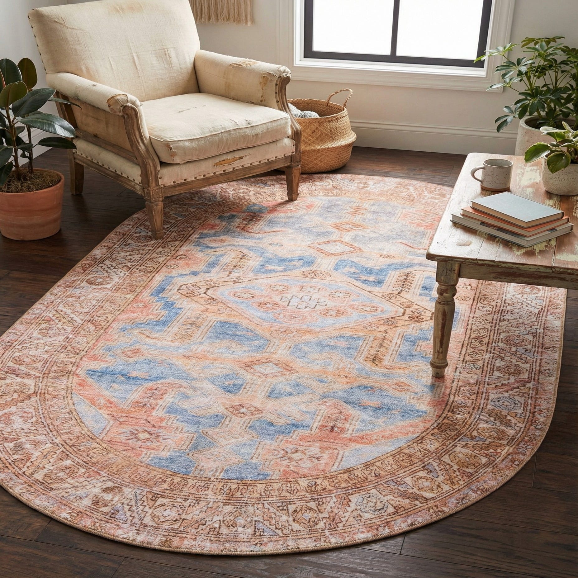Primary color is Blue. Colors in this rug include: Blue, Beige, Brown, Rust Red.