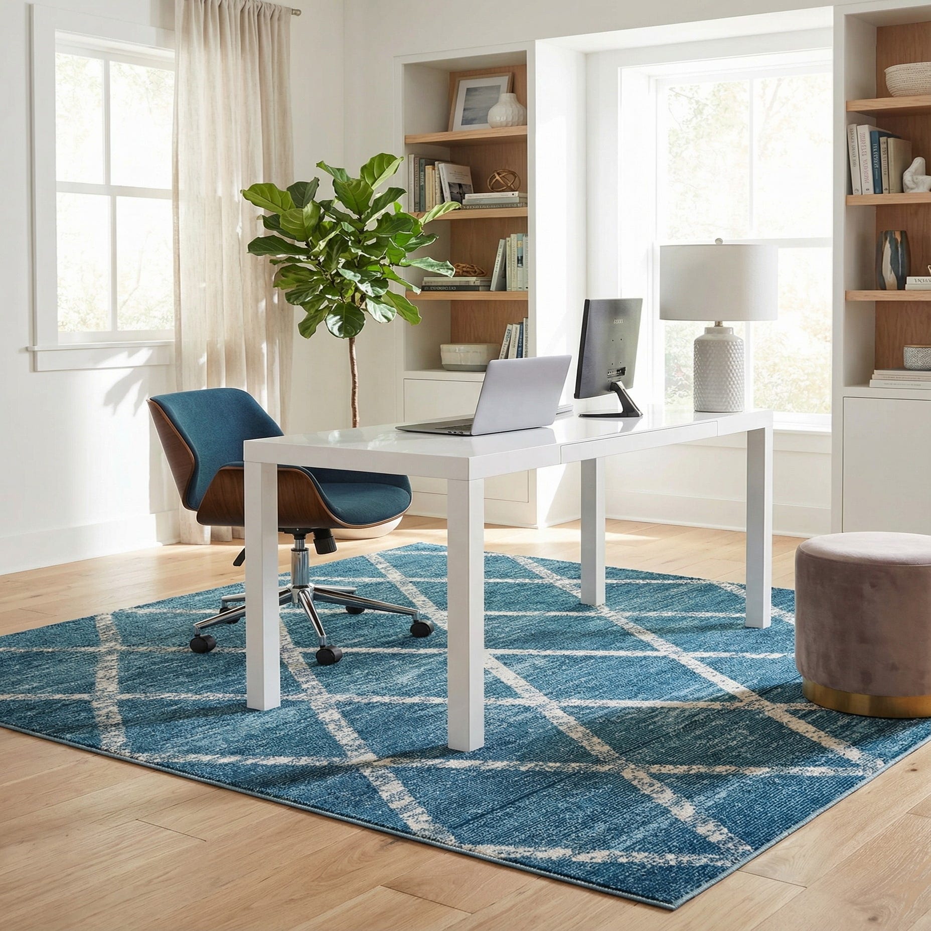 Primary color is Blue. Colors in this rug include: Blue, Light Blue, Ivory, Navy Blue.
