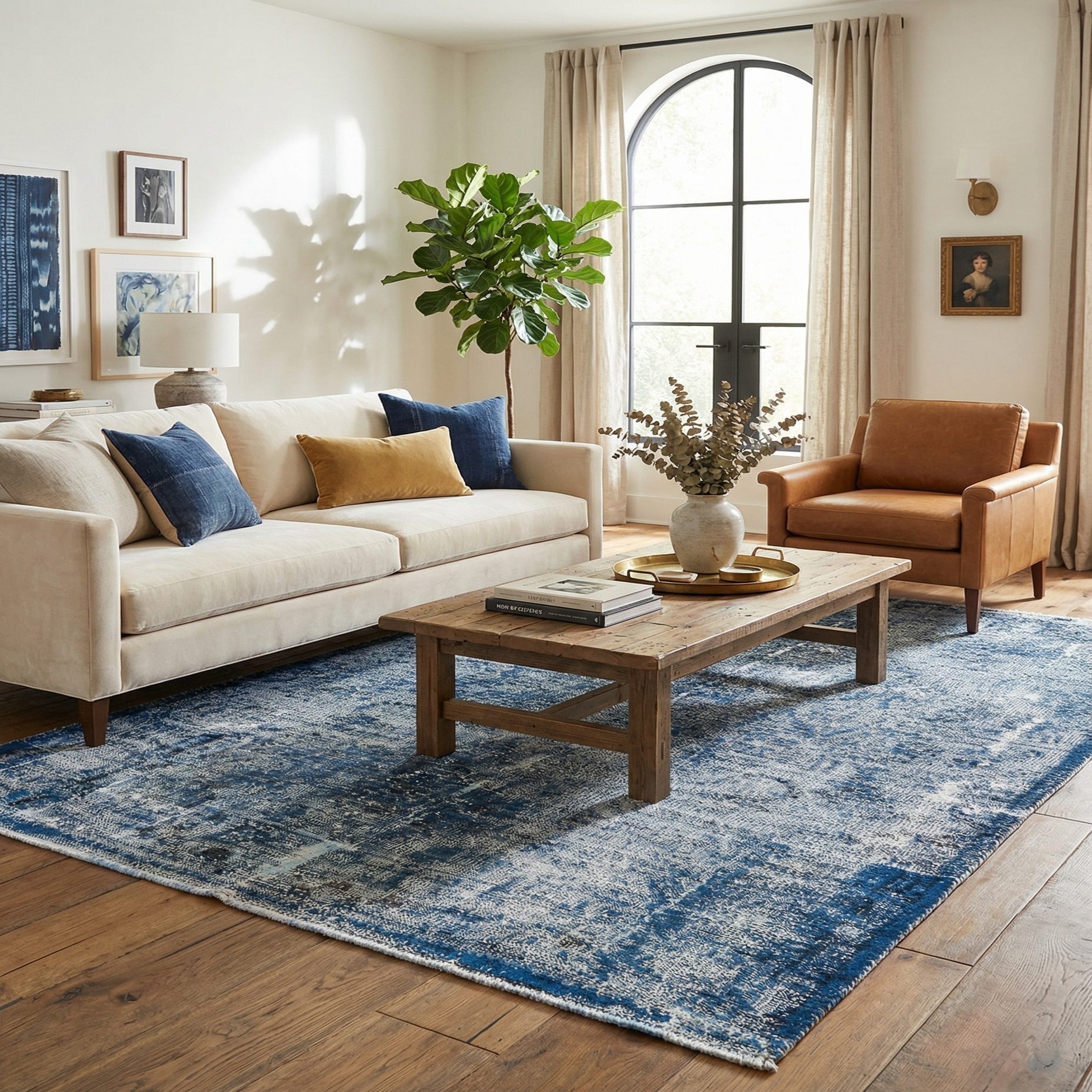 Primary color is Blue. Colors in this rug include: Blue, Navy Blue.