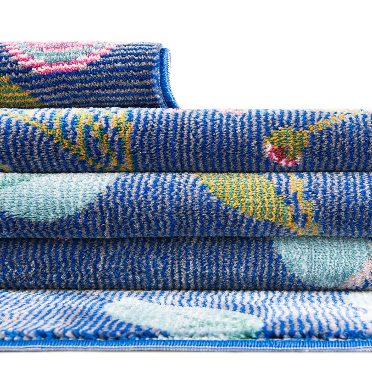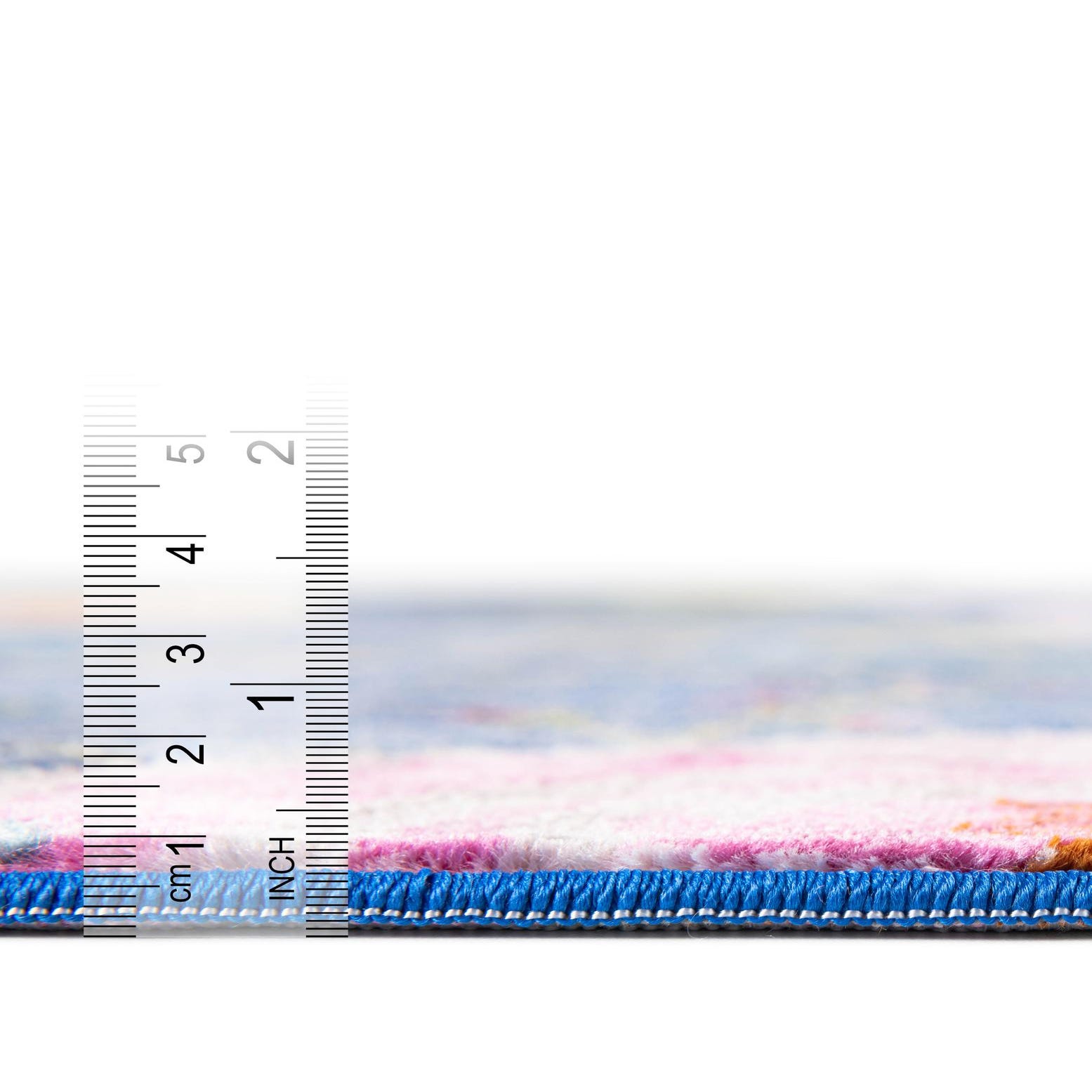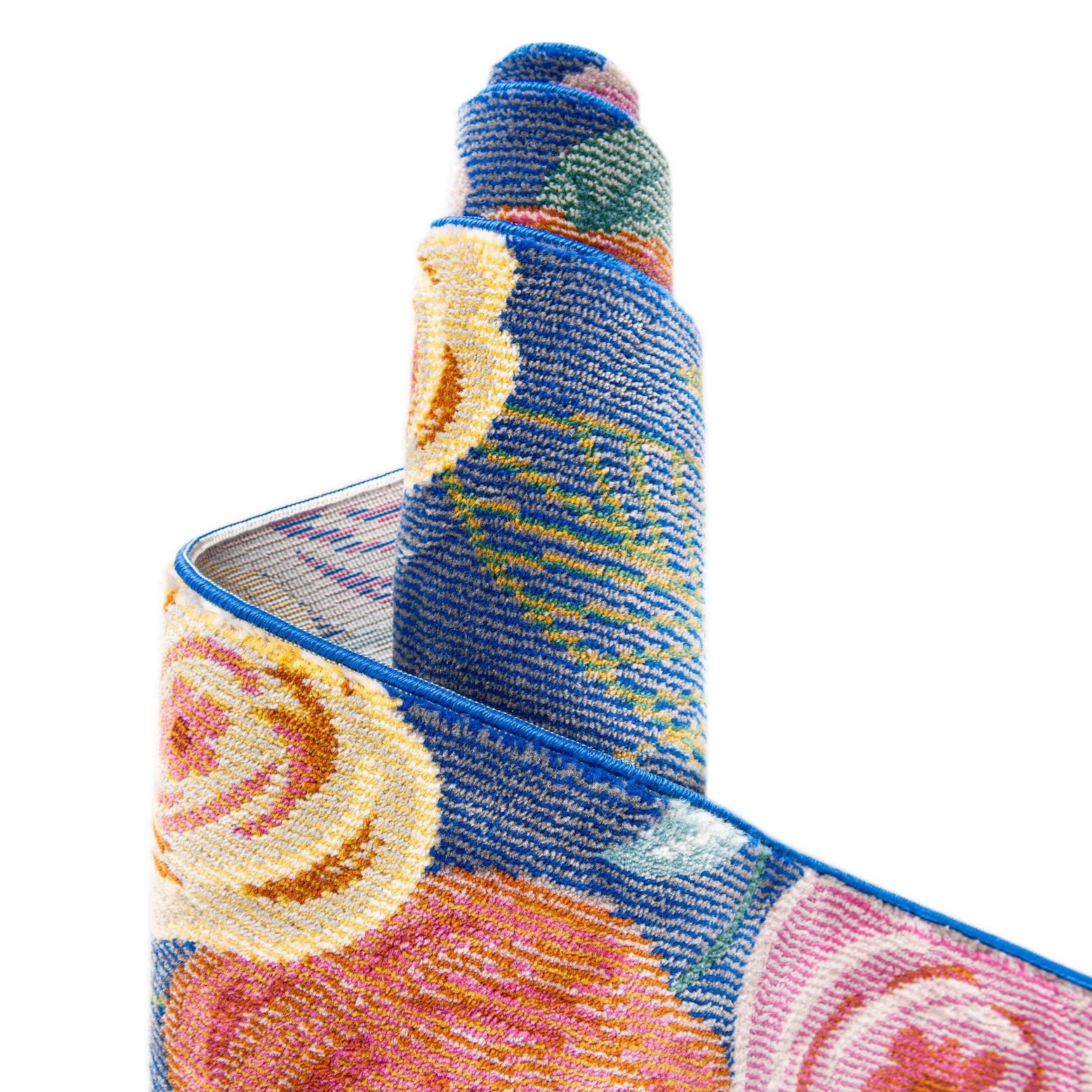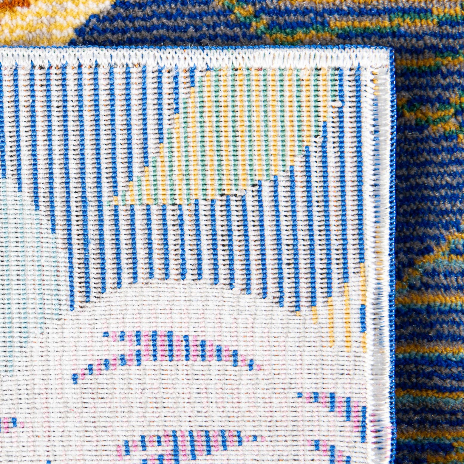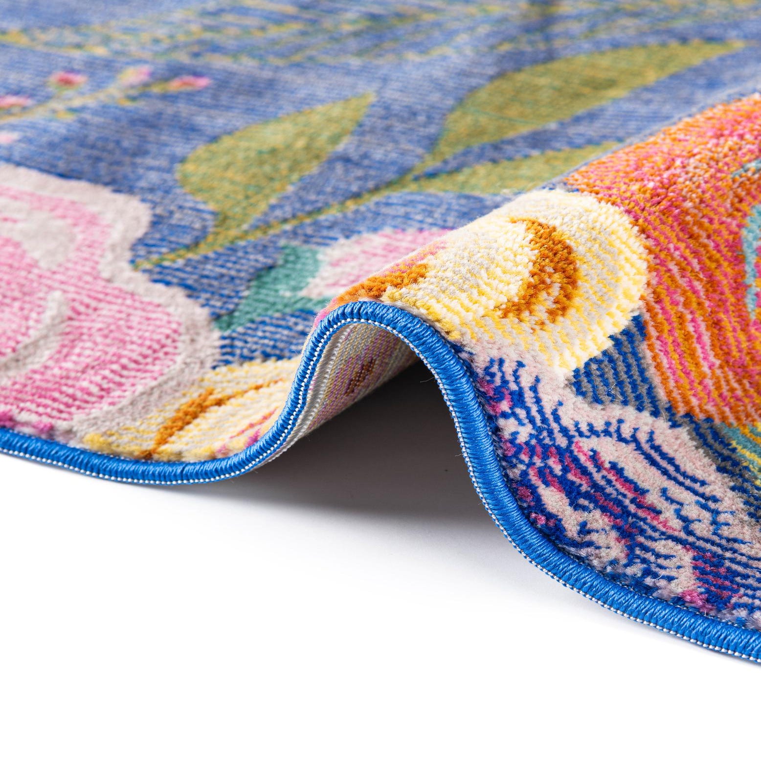 Primary color is Blue. Colors in this rug include: Blue, Ivory, Light Blue, Olive, Orange, Yellow, Pink, Red.