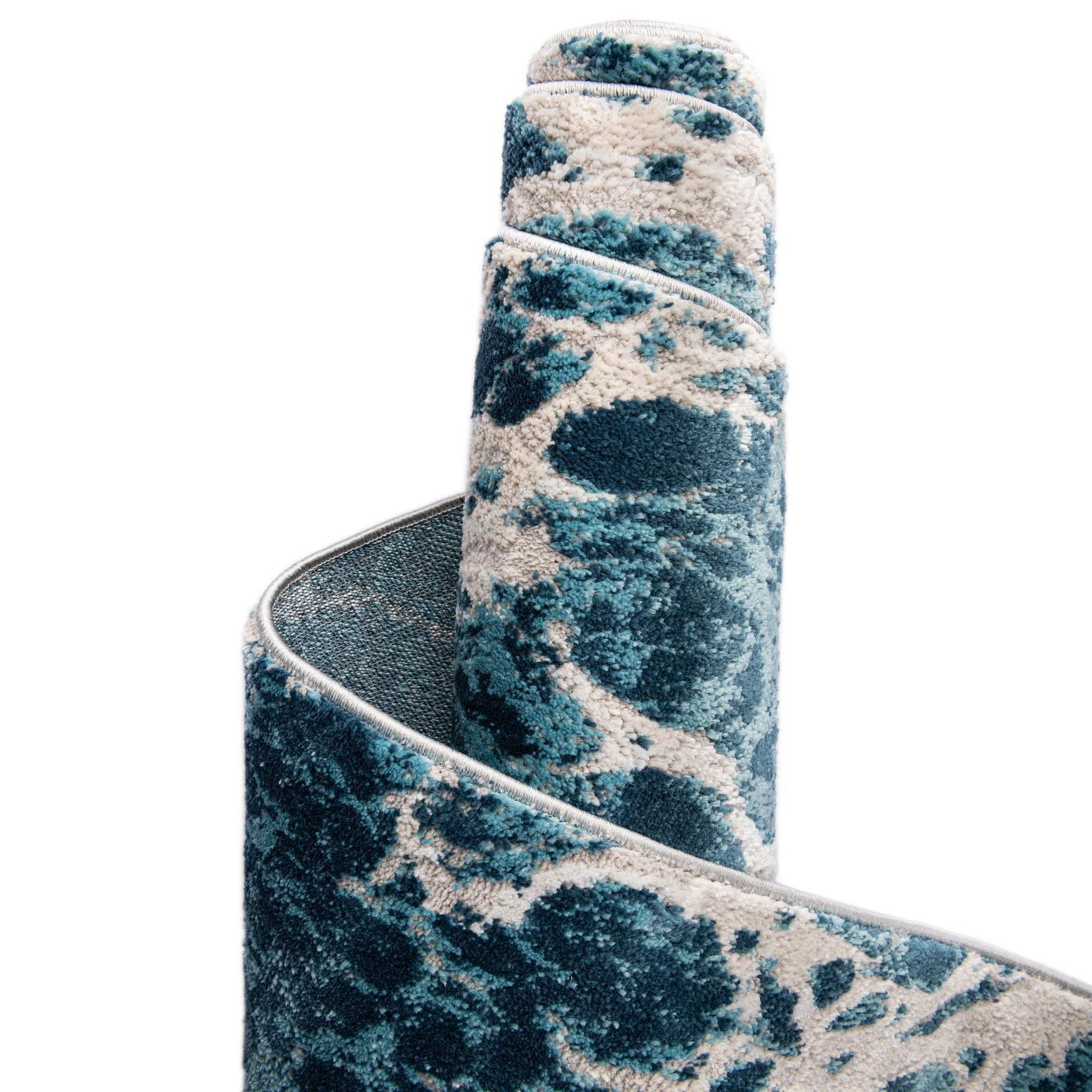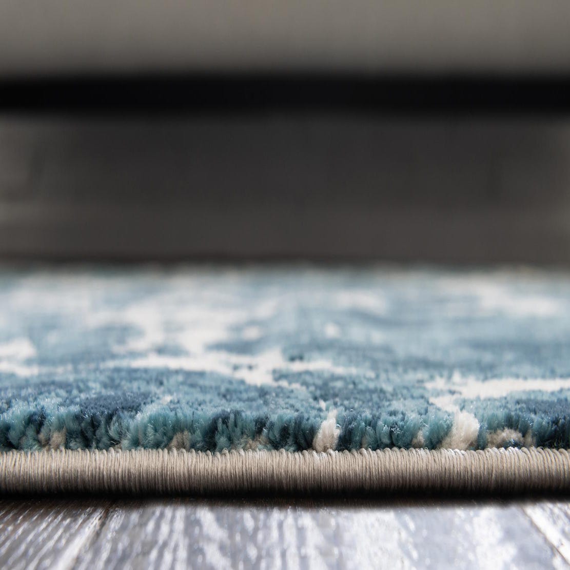 Primary color is Blue. Colors in this rug include: Blue, Gray, Ivory, Navy Blue.