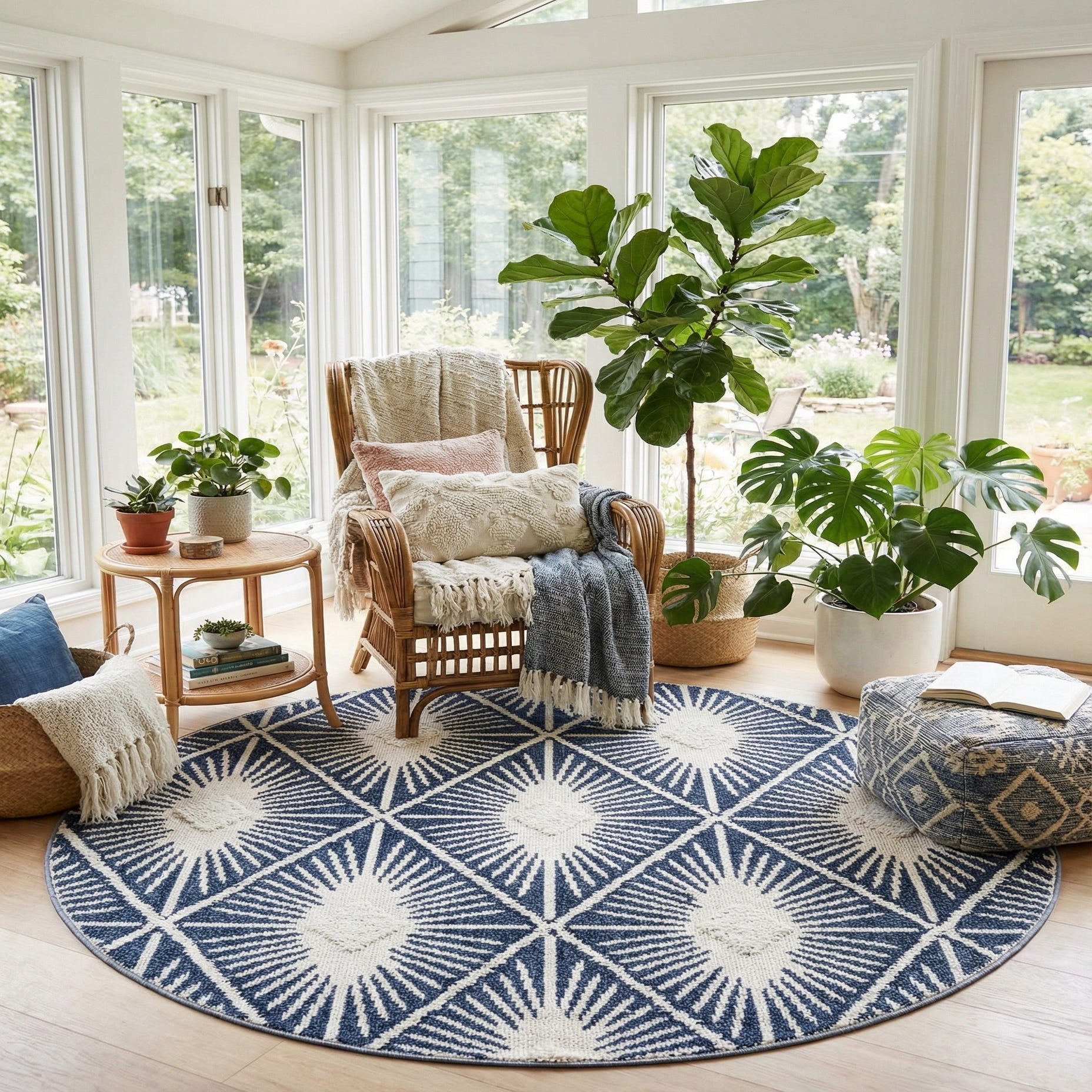 Primary color is Blue. Colors in this rug include: Blue, Ivory.