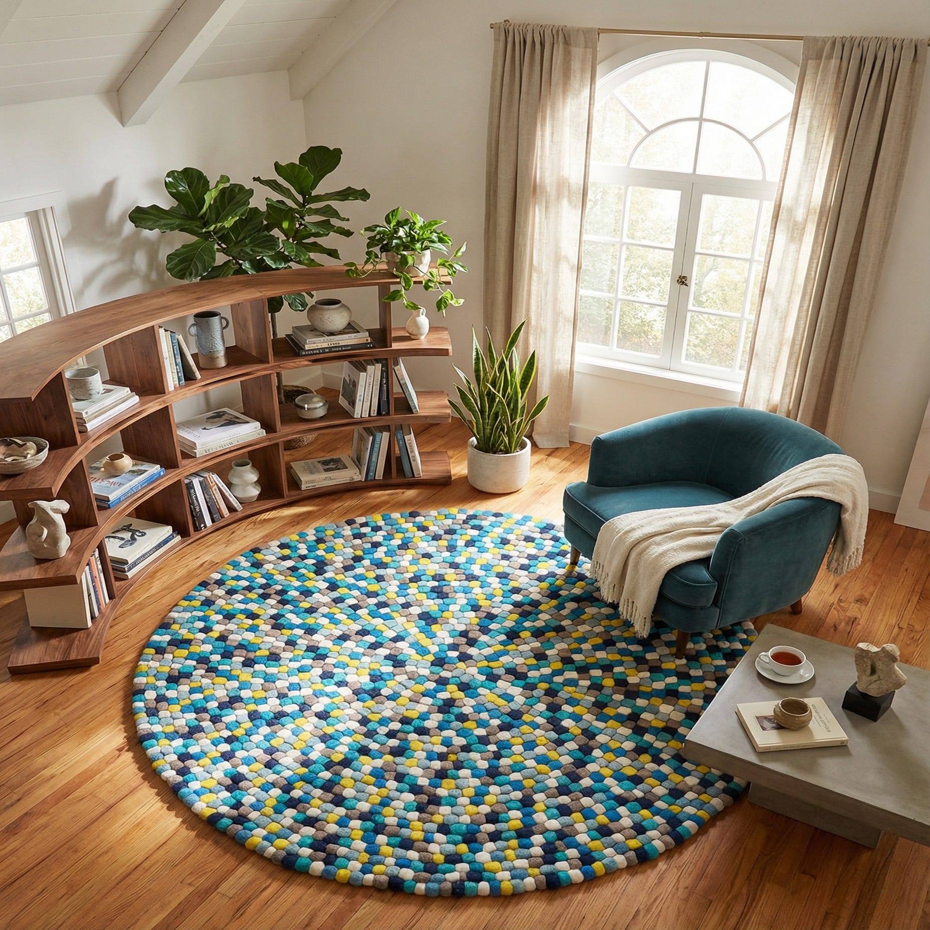 6' 1 x 6' 1 Hand Woven Felt Ball Wool Round Rug