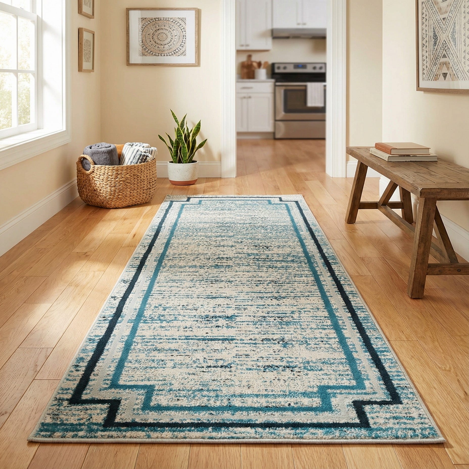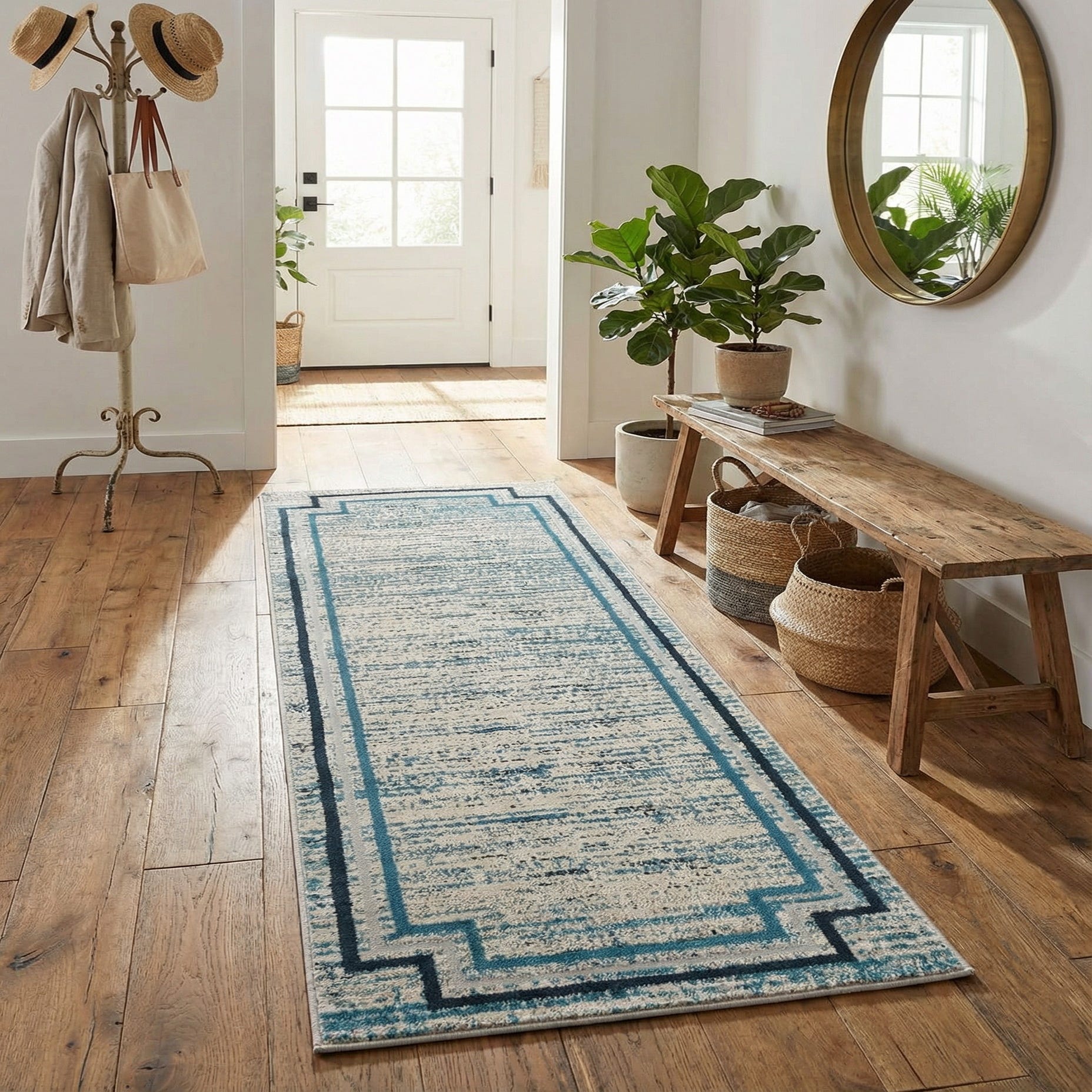 Primary color is Blue. Colors in this rug include: Blue, Gray, Ivory, Navy Blue.