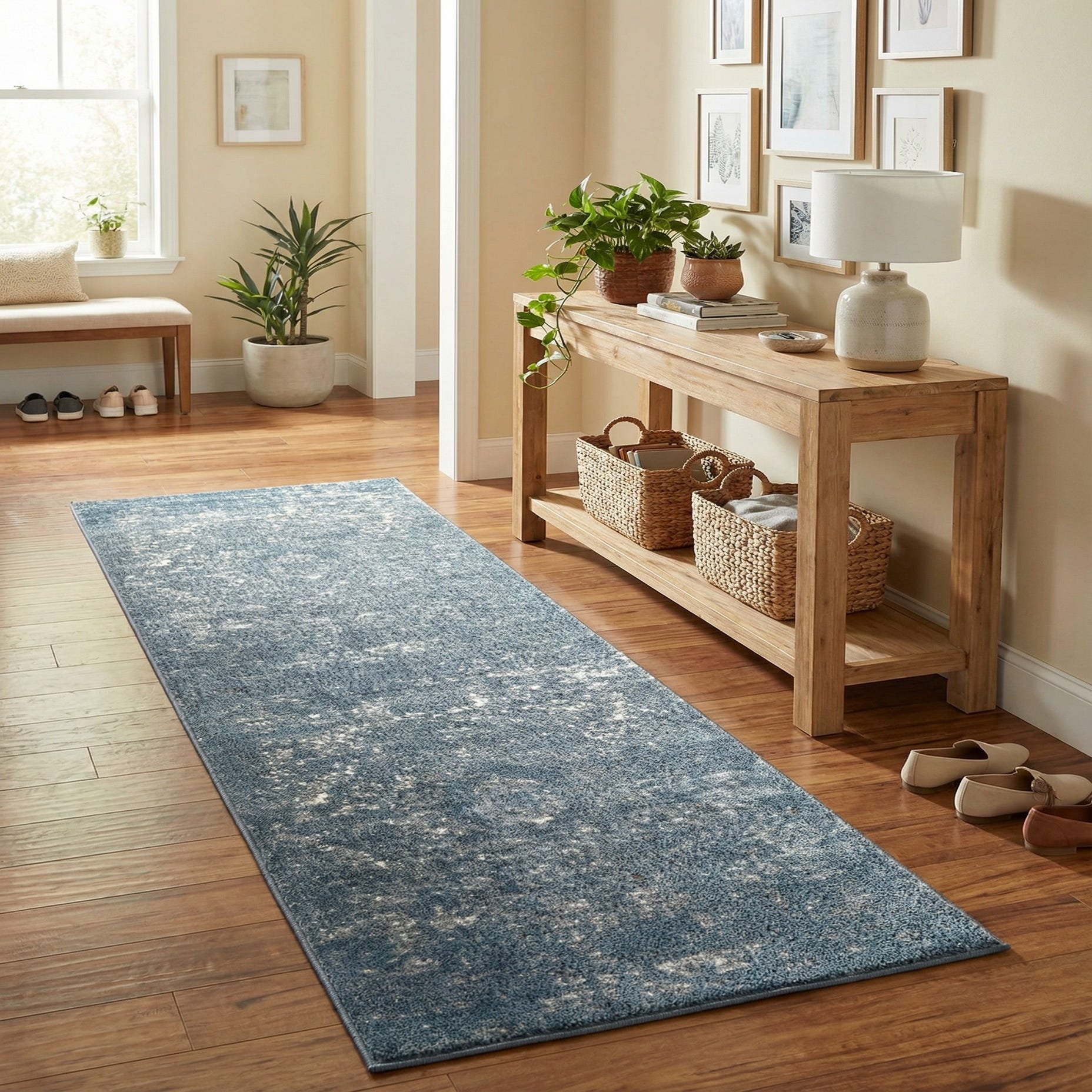 Primary color is Blue. Colors in this rug include: Blue, Gray, Ivory.