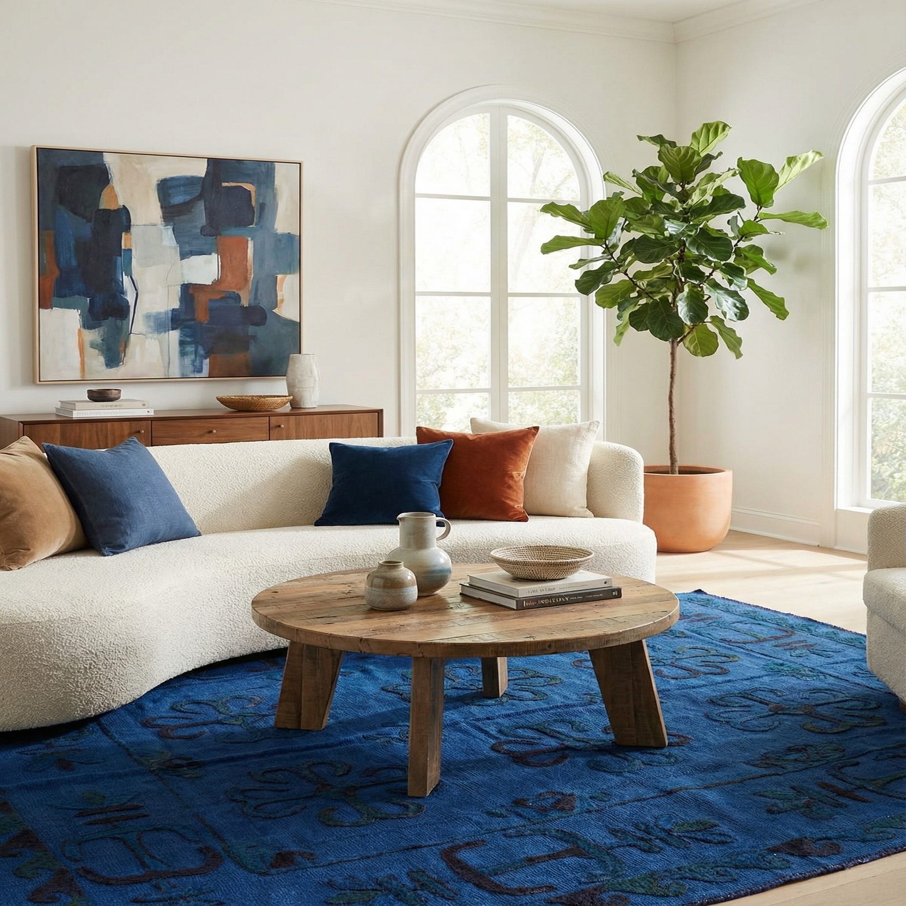 Primary color is Blue. Colors in this rug include: Blue, Burgundy, Green.