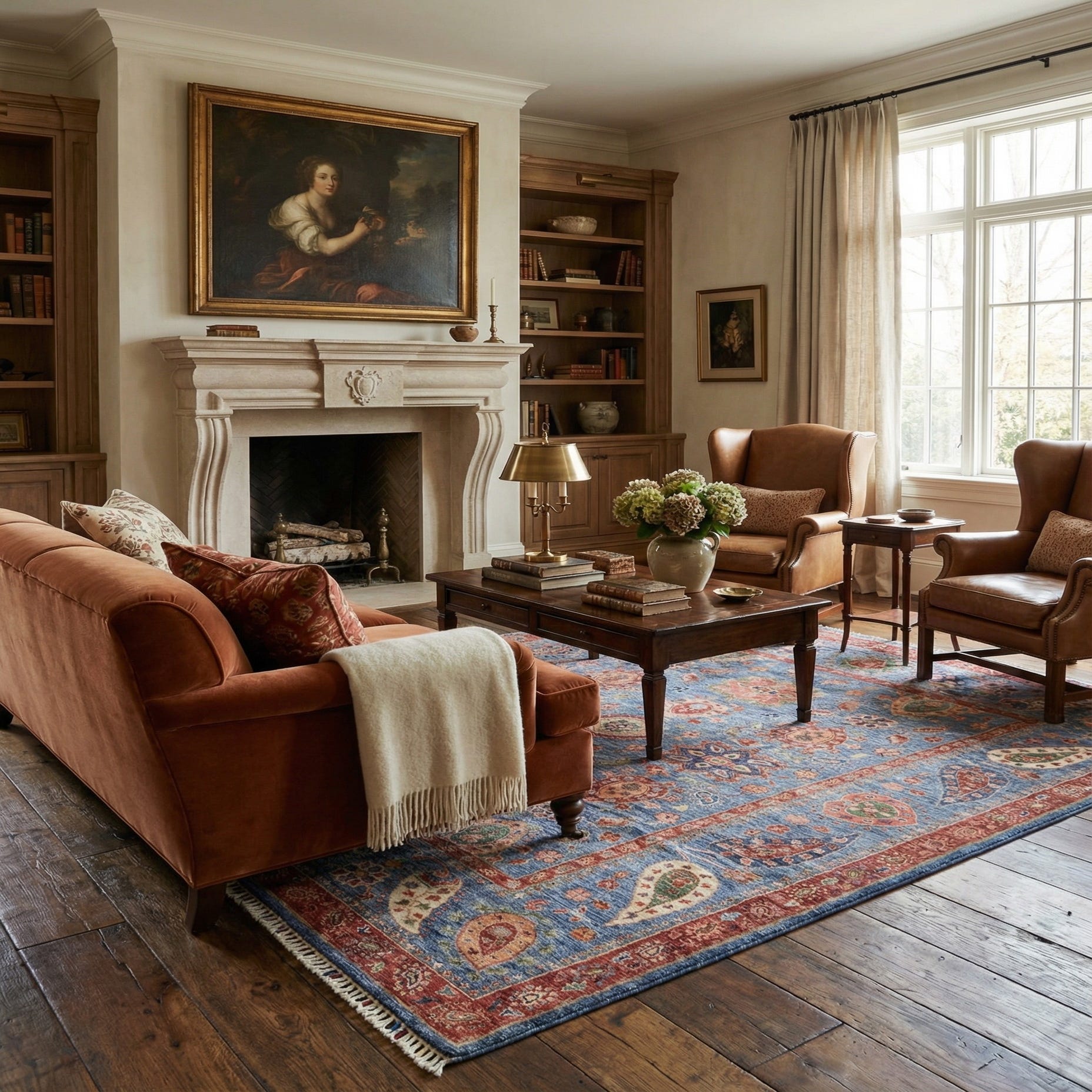 Primary color is Blue. Colors in this rug include: Blue, Black, Brown, Cream, Green, Maroon, Navy Blue, Gold, Peach.