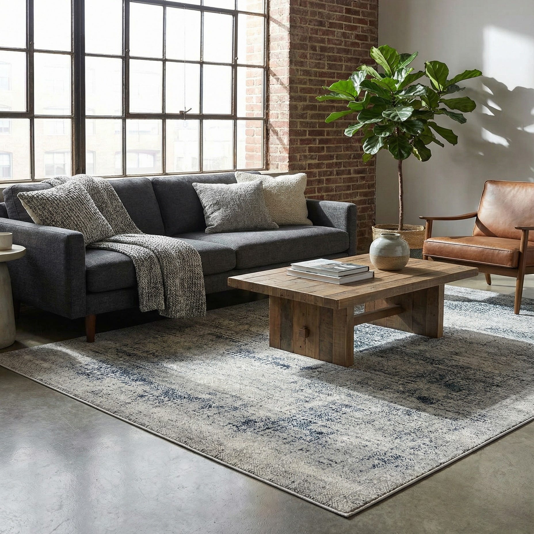 Primary color is Blue. Colors in this rug include: Blue, Ivory, Gray, Light Blue.