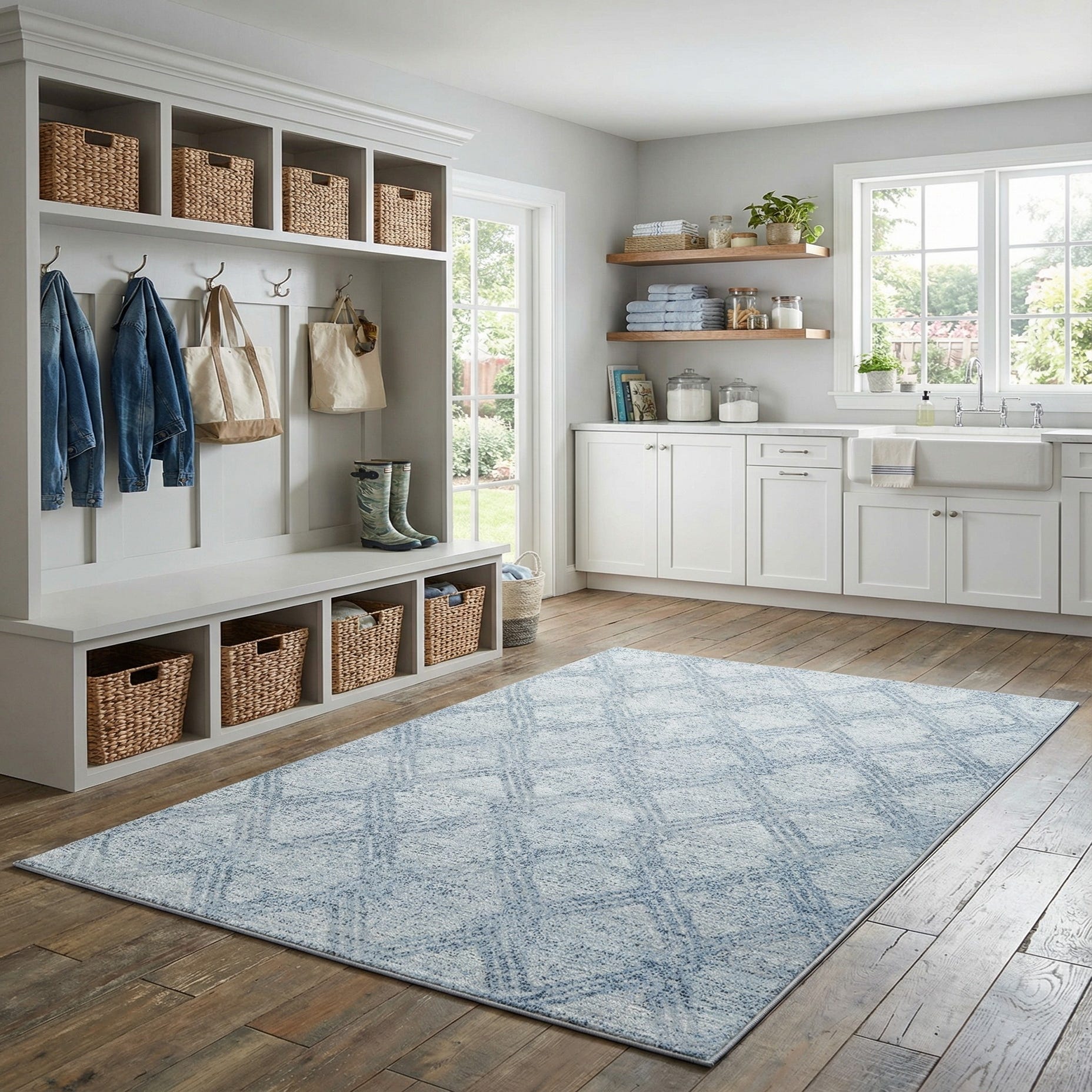 Primary color is Blue. Colors in this rug include: Blue, Gray, Ivory.