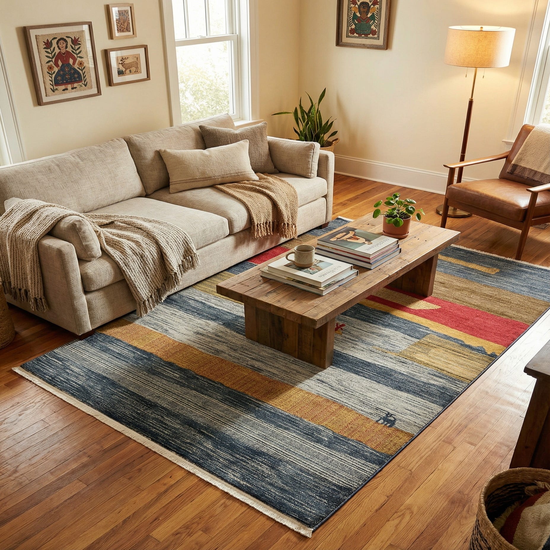 Primary color is Blue. Colors in this rug include: Blue, Light Blue, Red, Tan, Beige.