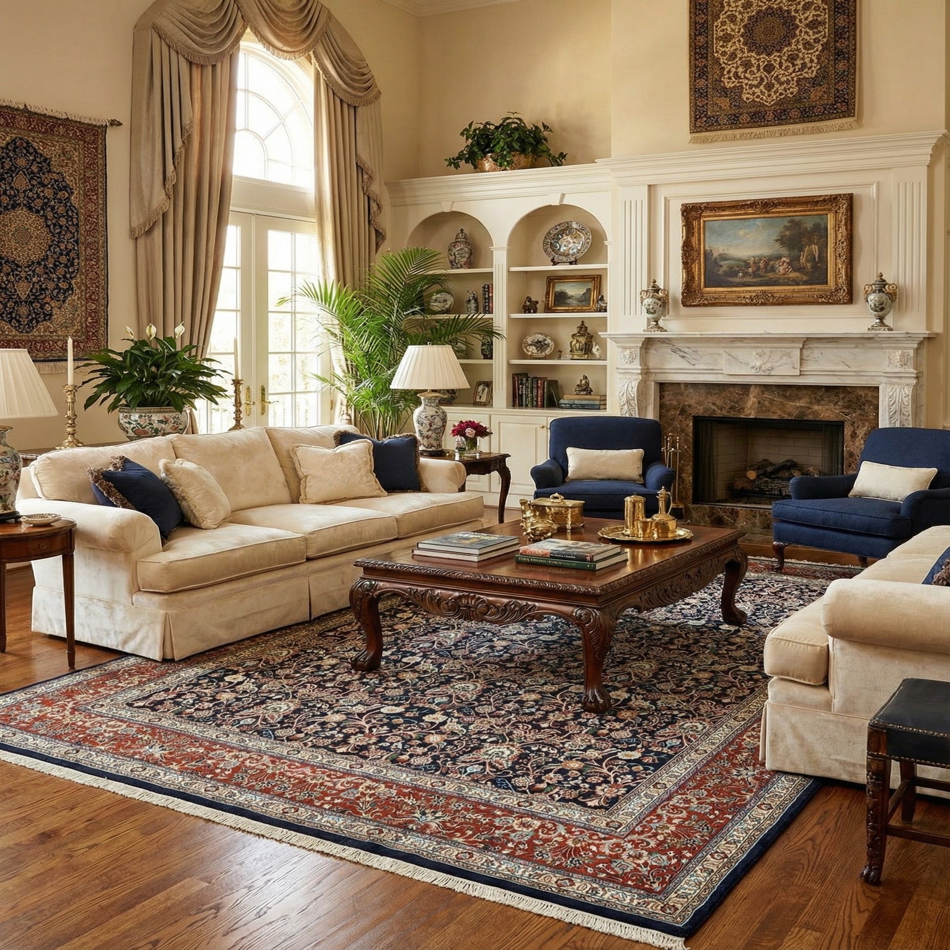 Primary color is Blue. Colors in this rug include: Blue, Dark Blue, Red, Beige, Cream, Green, Grey, Blue.