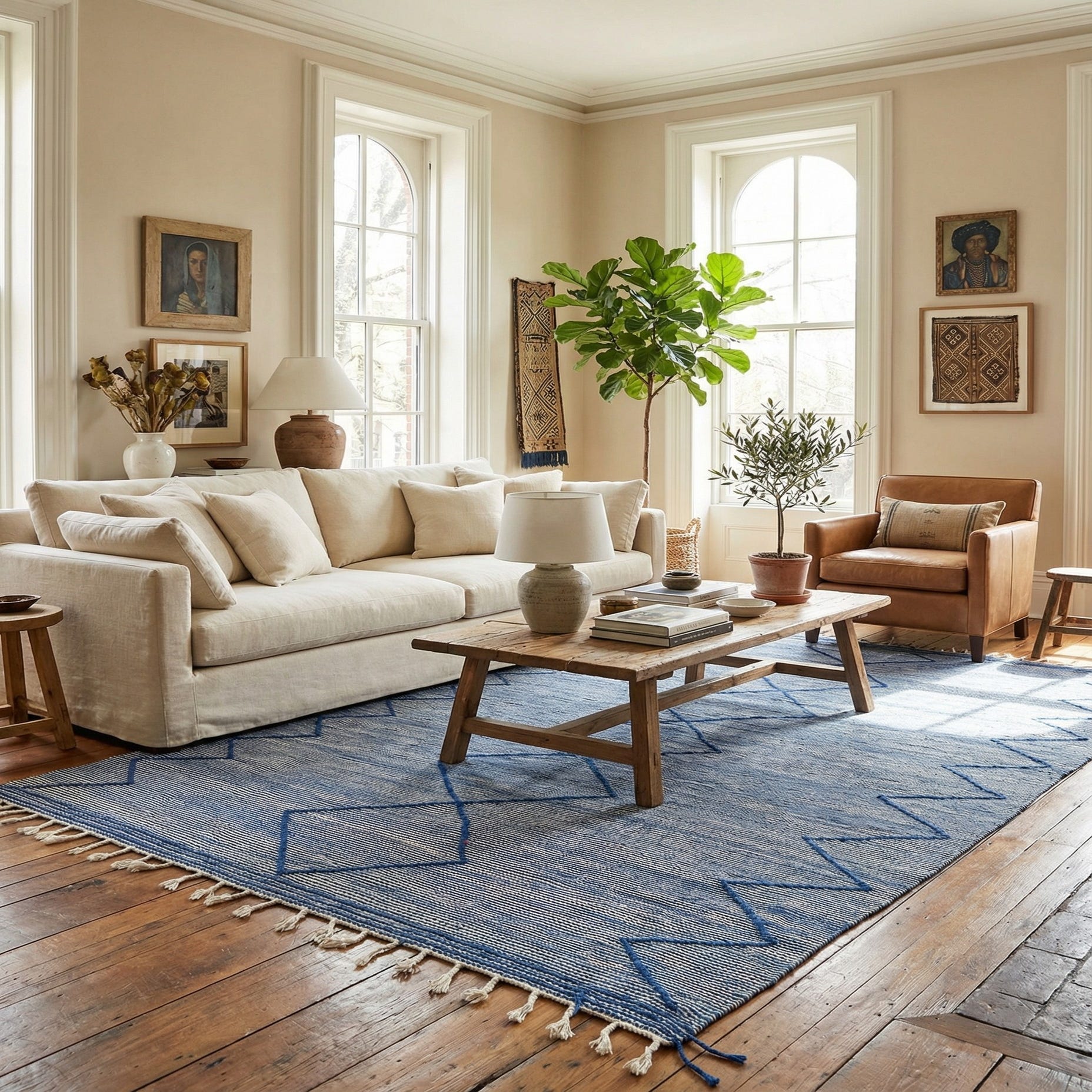Primary color is Blue. Colors in this rug include: Blue, Ivory.