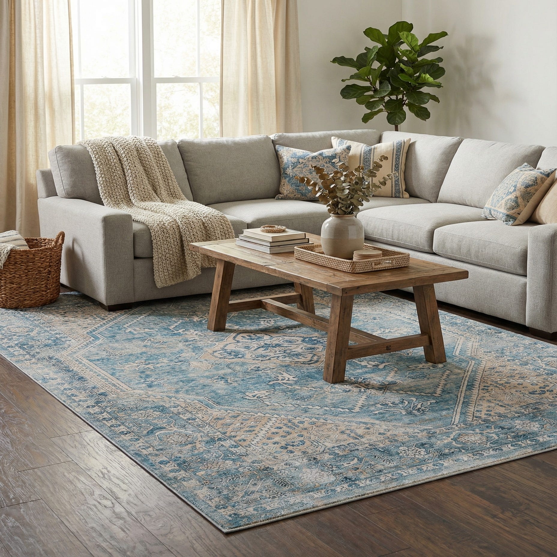 Primary color is Blue. Colors in this rug include: Blue, Light Blue, Light Brown.
