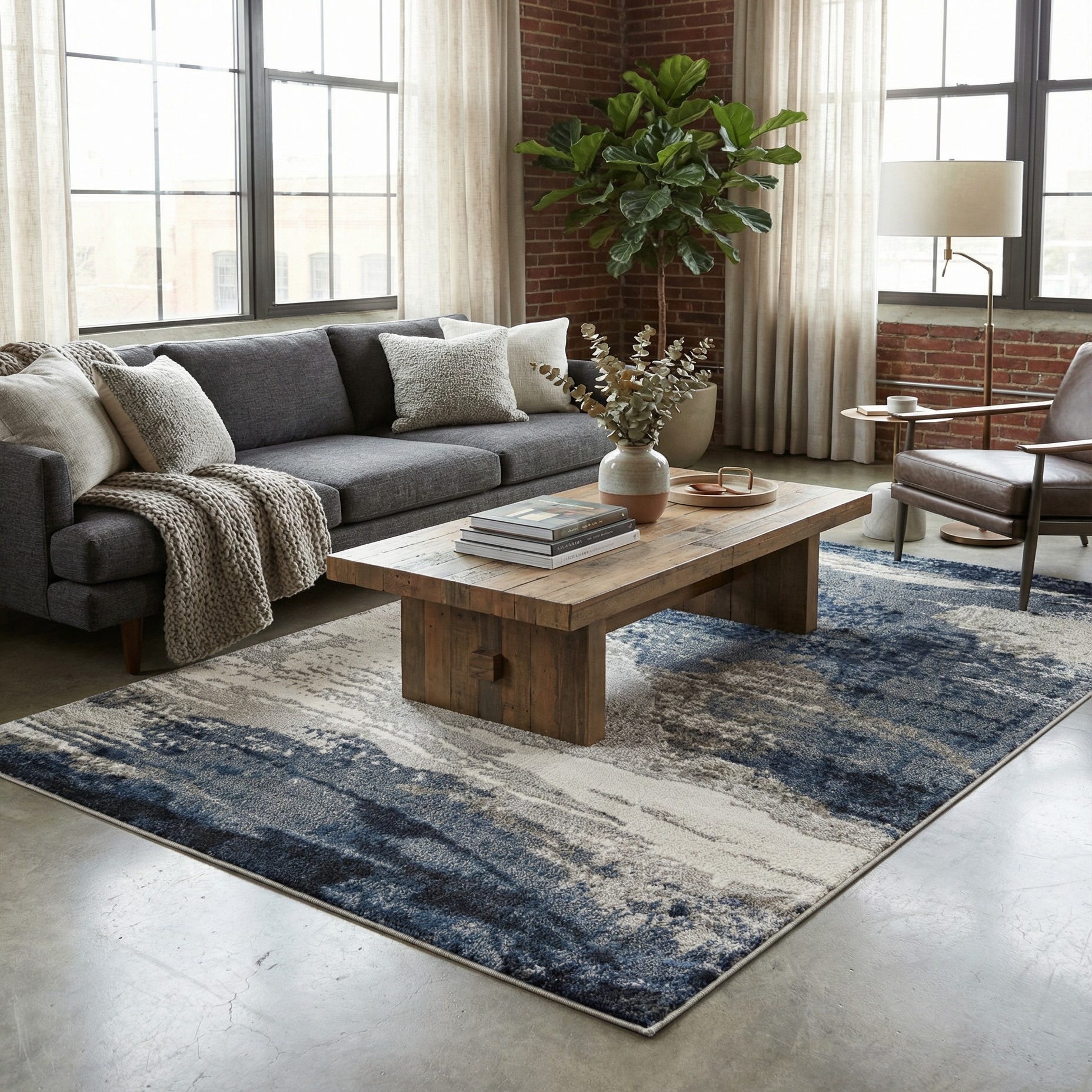 Primary color is Blue. Colors in this rug include: Blue, Black, Ivory, Gray.