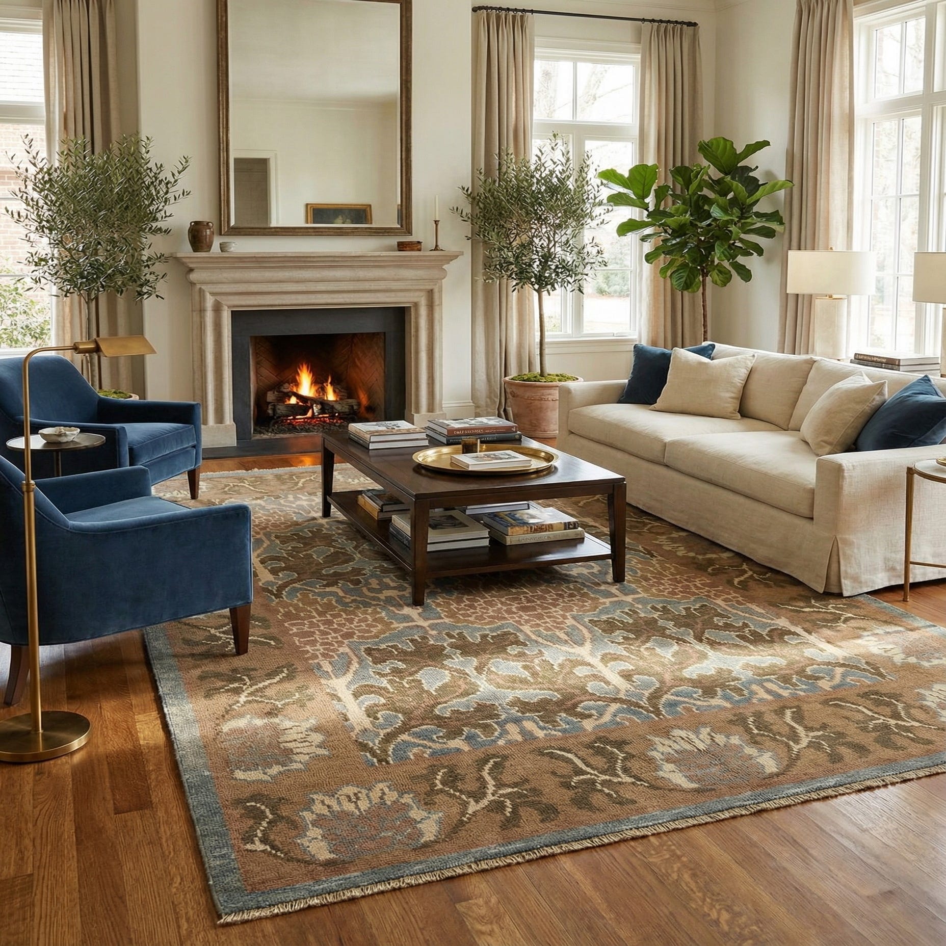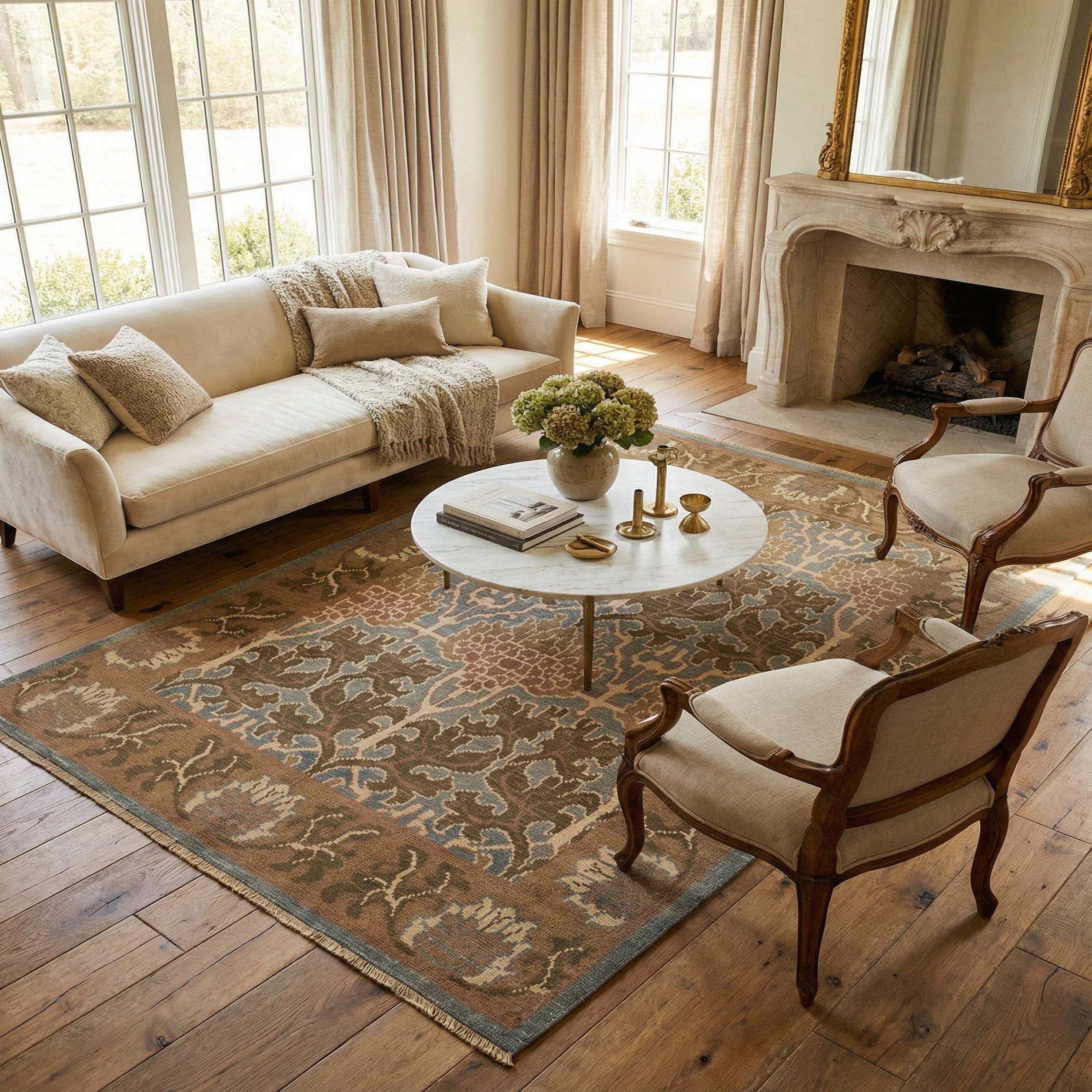 Primary color is Blue. Colors in this rug include: Blue, Brown, Gold, Peach, Tan, Light Brown.