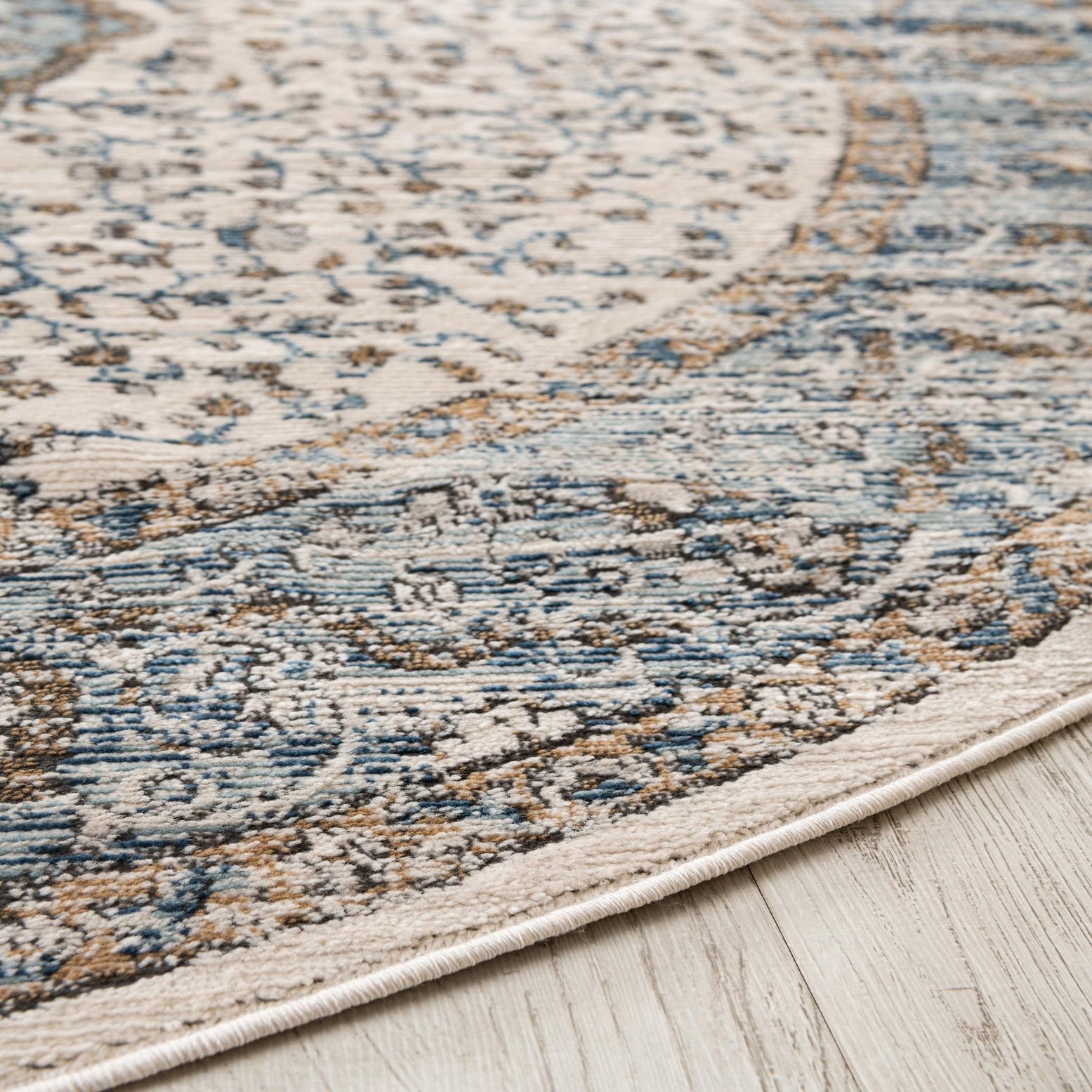 Primary color is Blue. Colors in this rug include: Blue, Beige, Brown, Ivory, Light Blue.