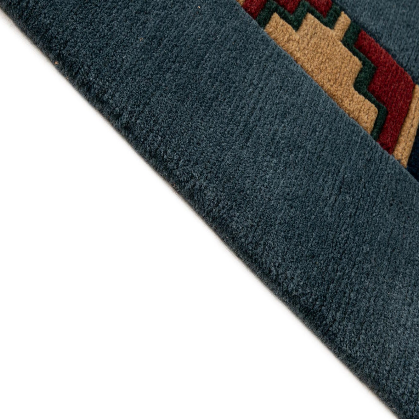 Primary color is Blue. Colors in this rug include: Blue, Beige, Green, Navy Blue, Rust Red.