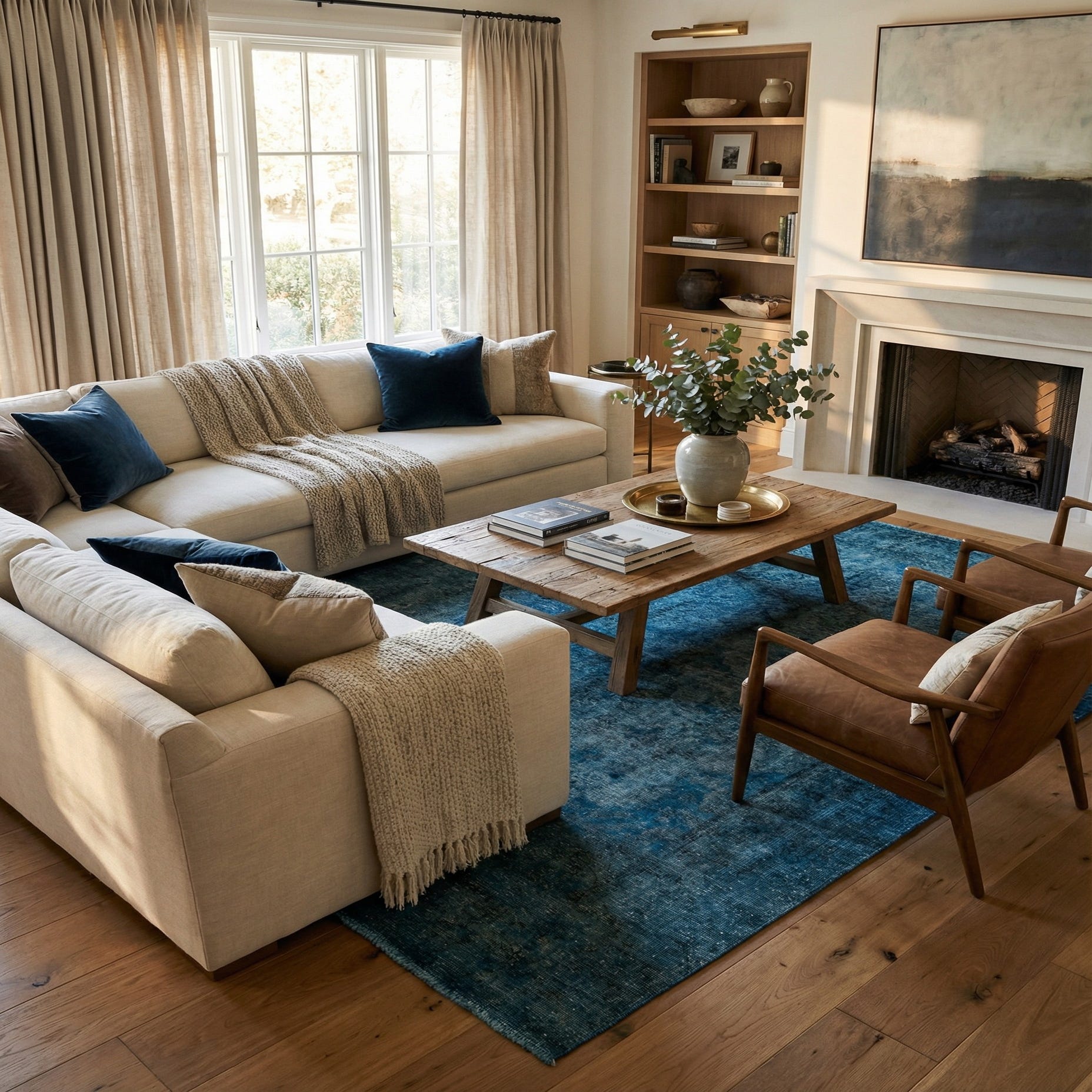 Primary color is Blue. Colors in this rug include: Blue, Navy Blue, Ivory.