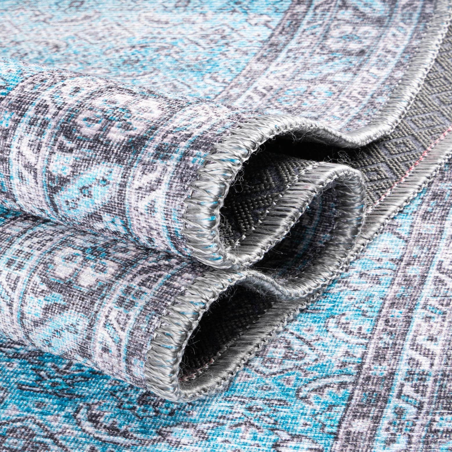 Primary color is Blue. Colors in this rug include: Blue, Black, Ivory.