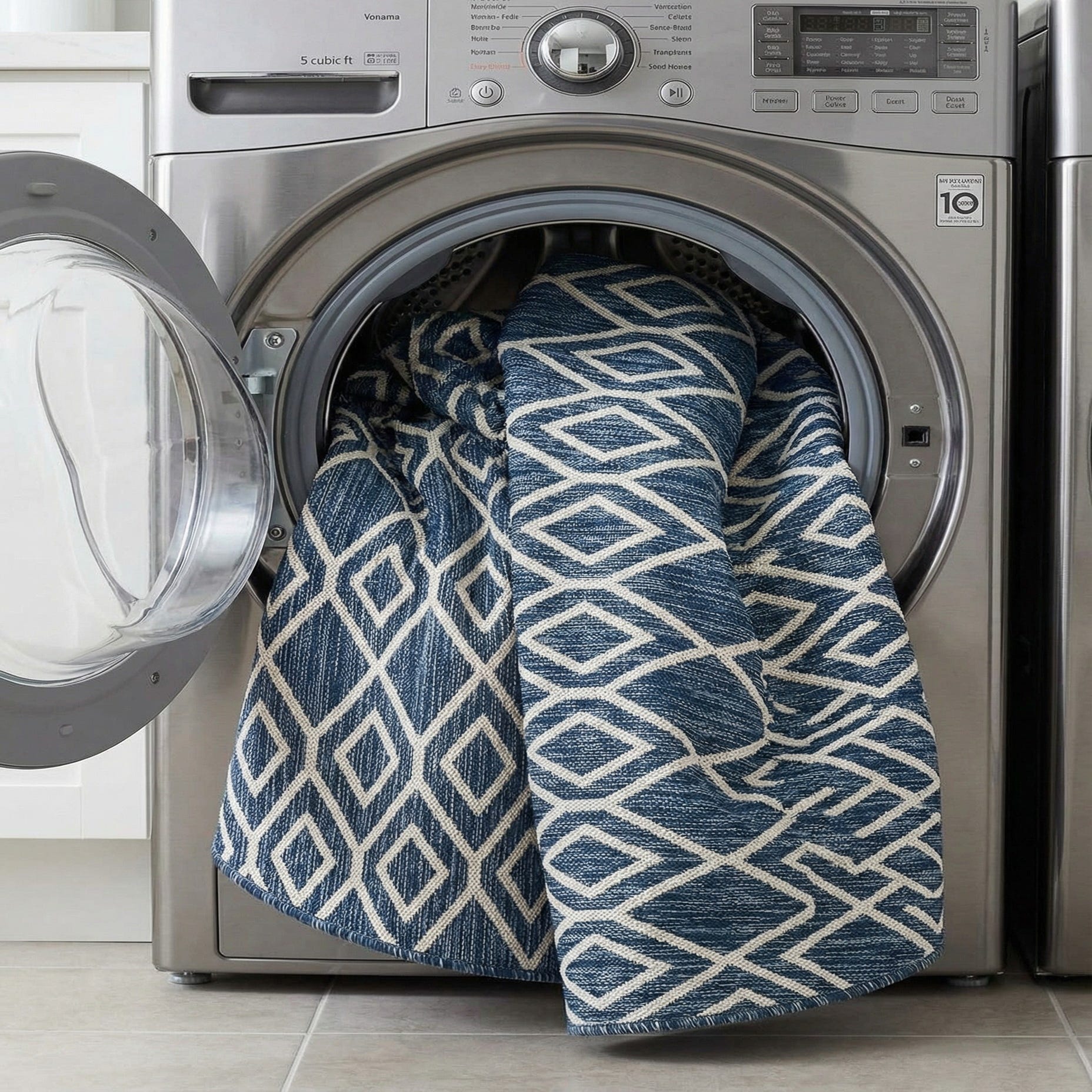 Primary color is Blue. Colors in this rug include: Blue, Ivory.
