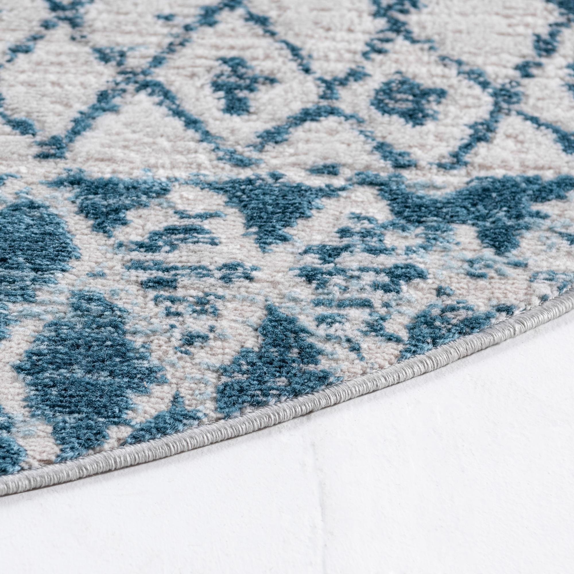 Primary color is Blue. Colors in this rug include: Blue, Gray, Ivory.