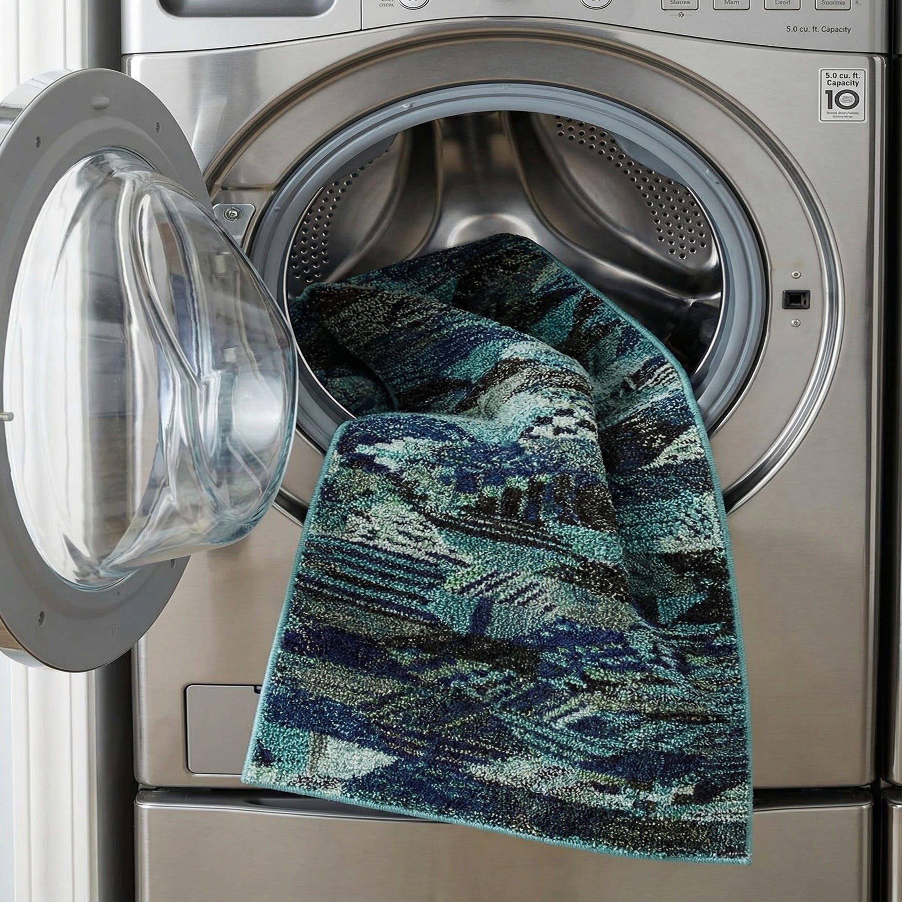Primary color is Blue. Colors in this rug include: Blue, Gray, Green, Light Blue, Navy Blue.