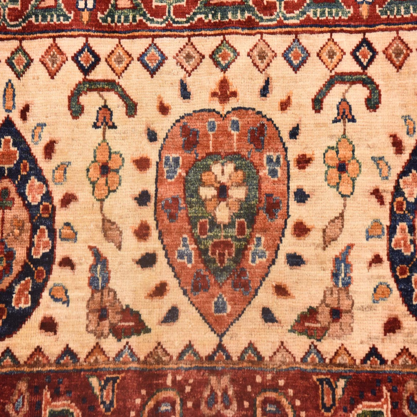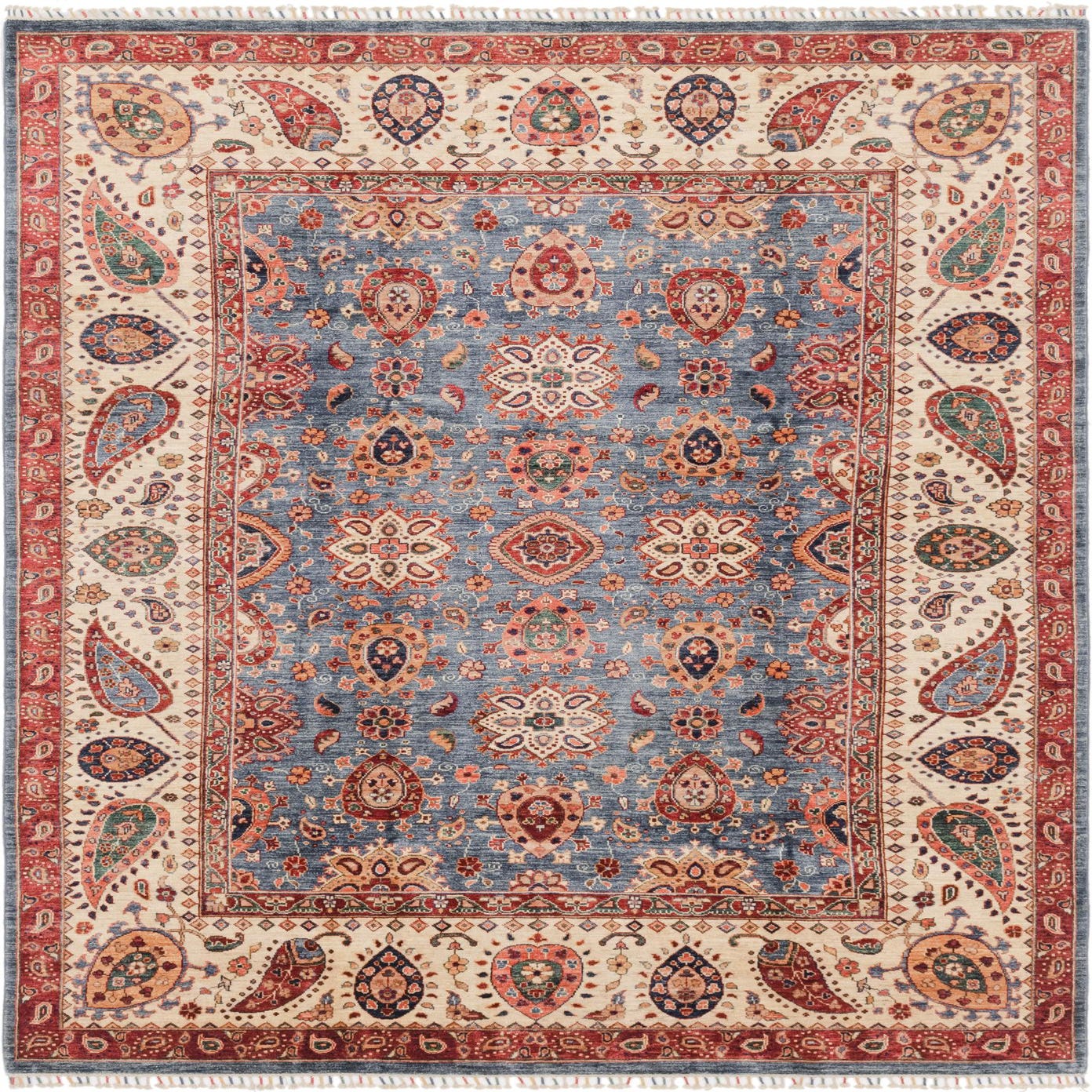 Primary color is Blue. Colors in this rug include: Blue, Black, Brown, Cream, Green, Maroon, Navy Blue, Orange, Peach, Red.