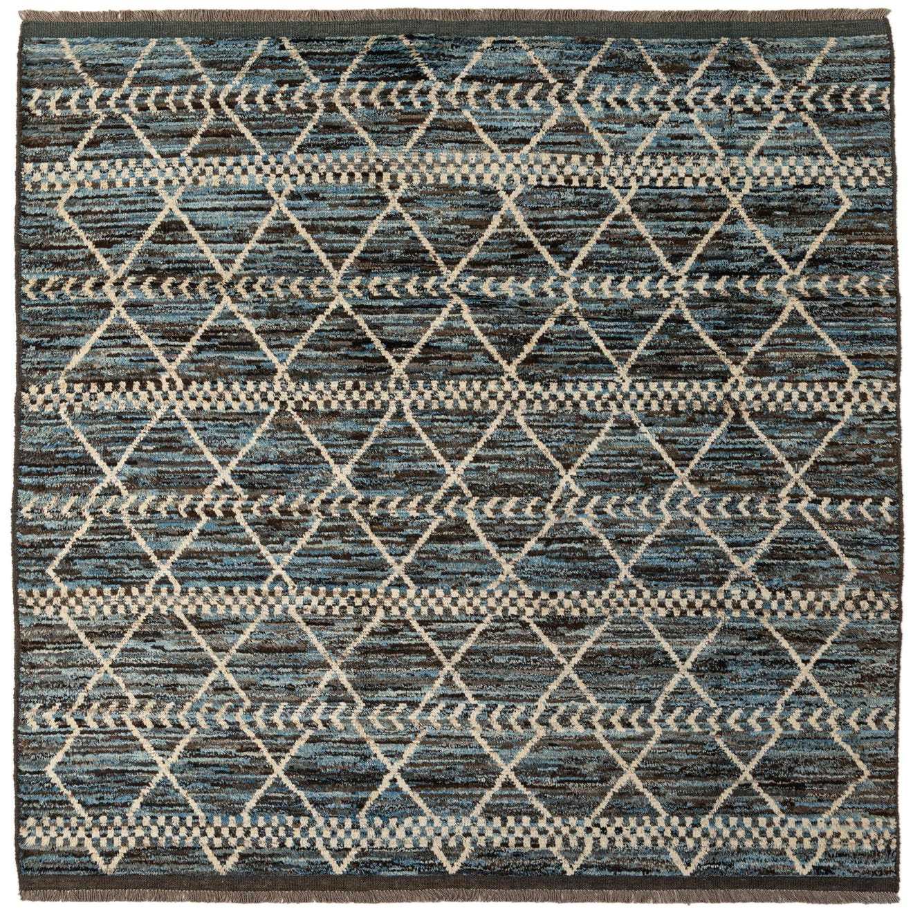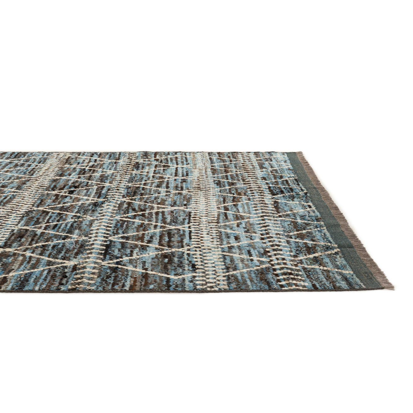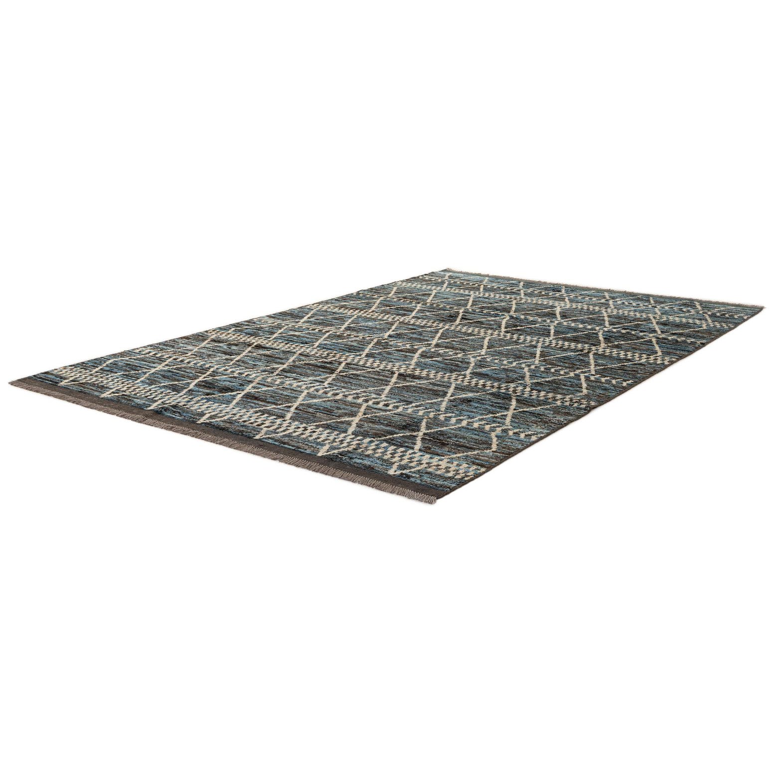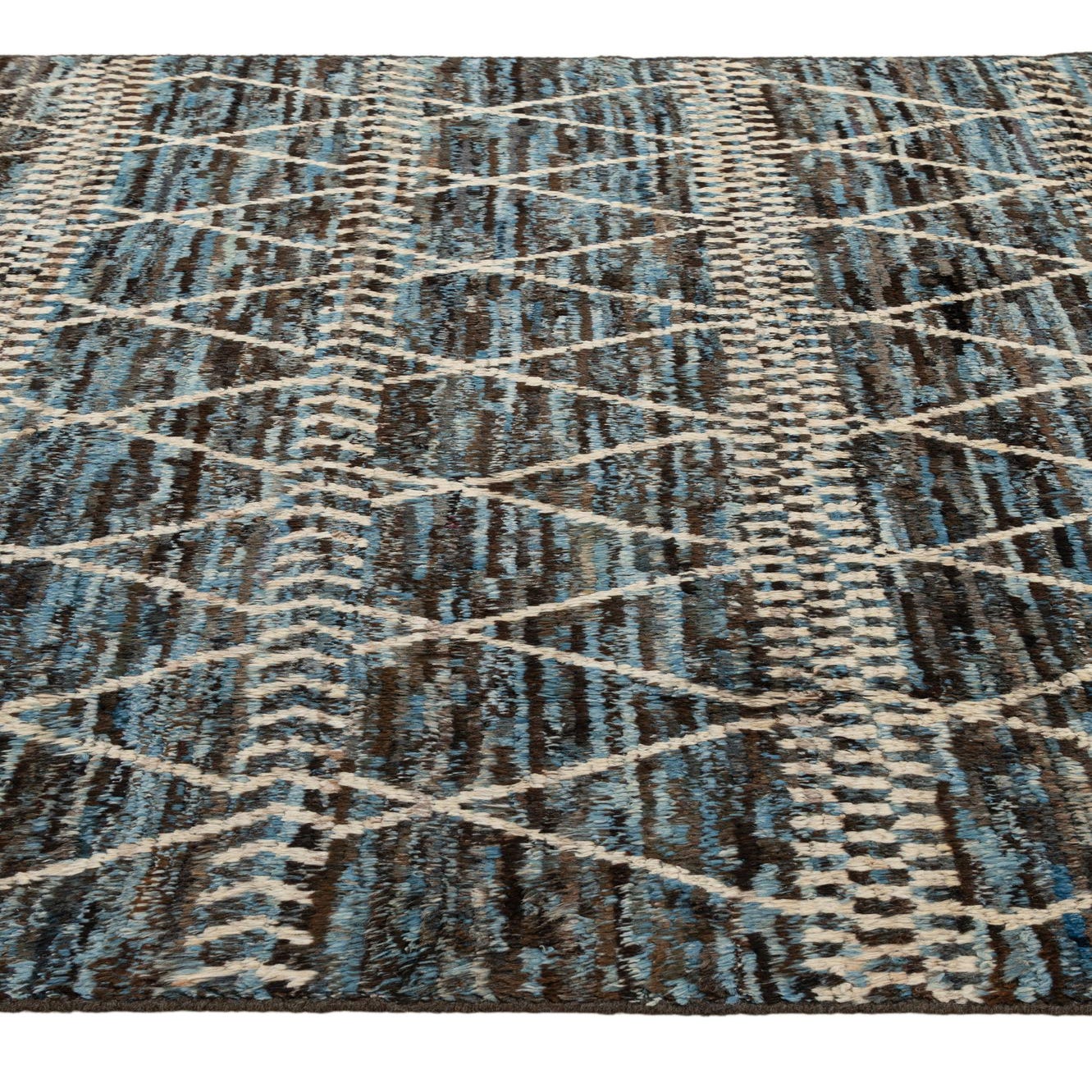 Primary color is Blue. Colors in this rug include: Blue, Black, Brown, Ivory, Gray.