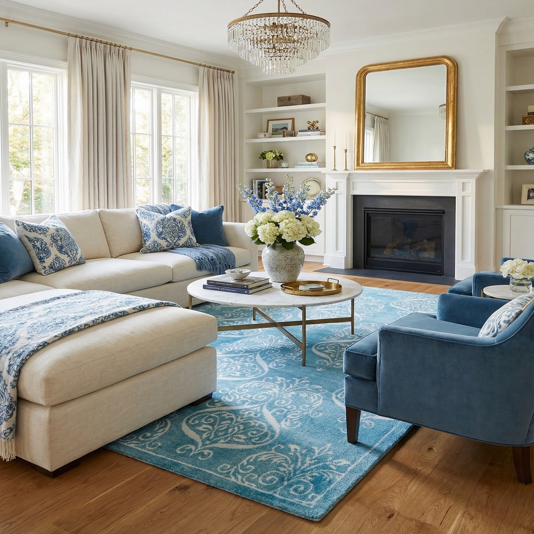 Primary color is Blue. Colors in this rug include: Blue, Light Blue, Turquoise.