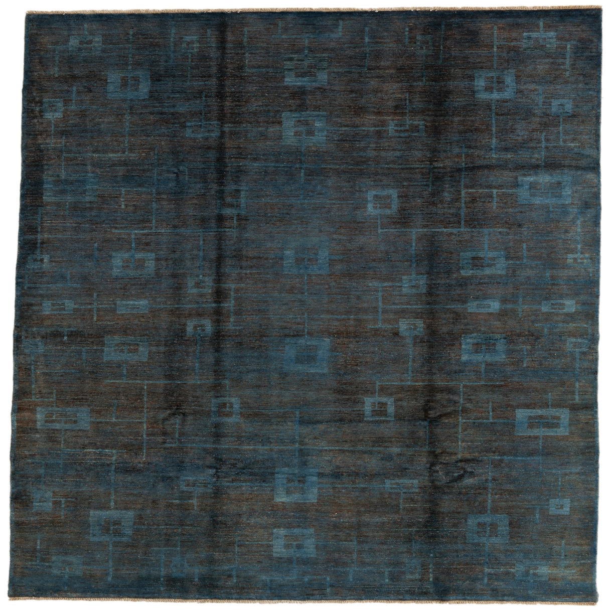 Primary color is Blue. Colors in this rug include: Blue, Brown, Black.