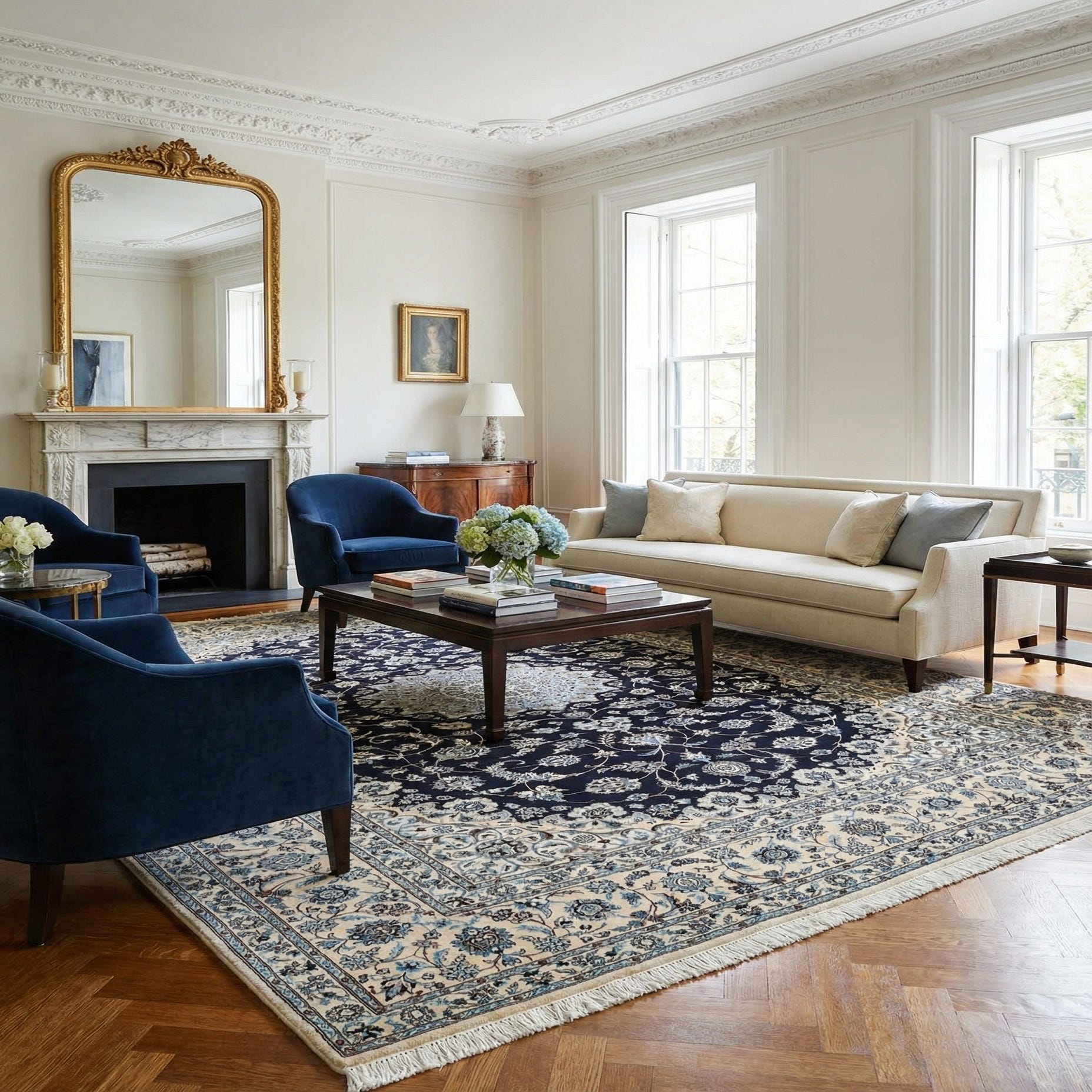 Primary color is Blue. Colors in this rug include: Blue, Dark Blue, Beige.