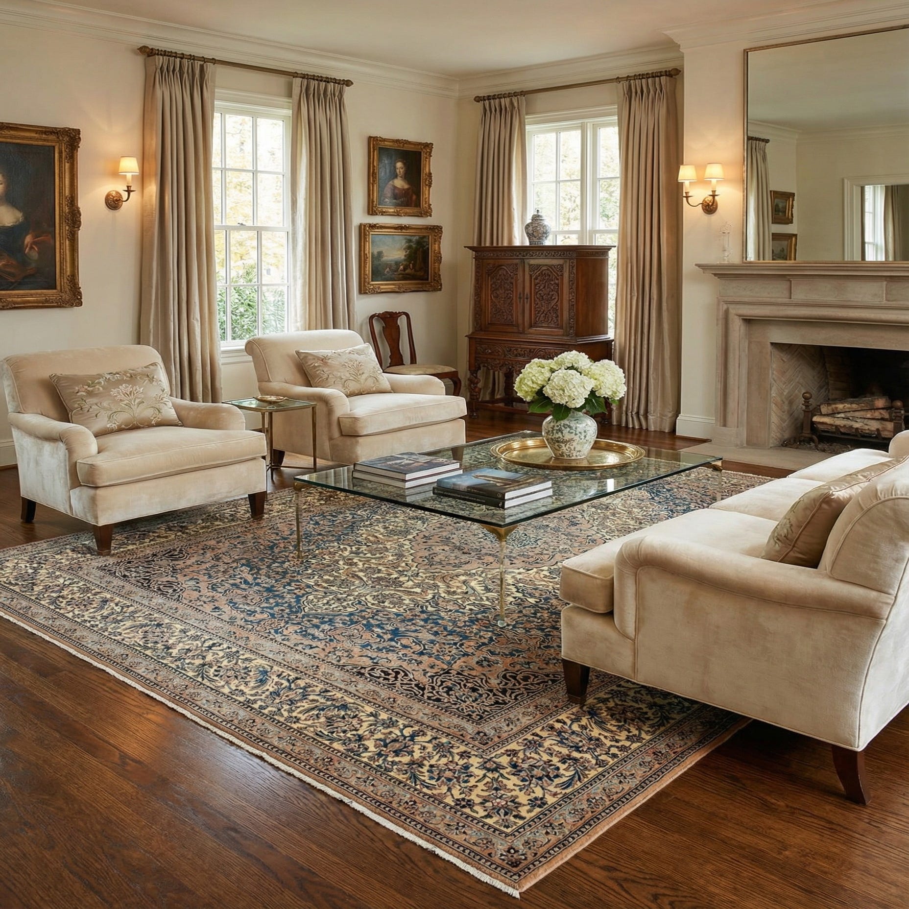 Primary color is Blue. Colors in this rug include: Blue, Brown.