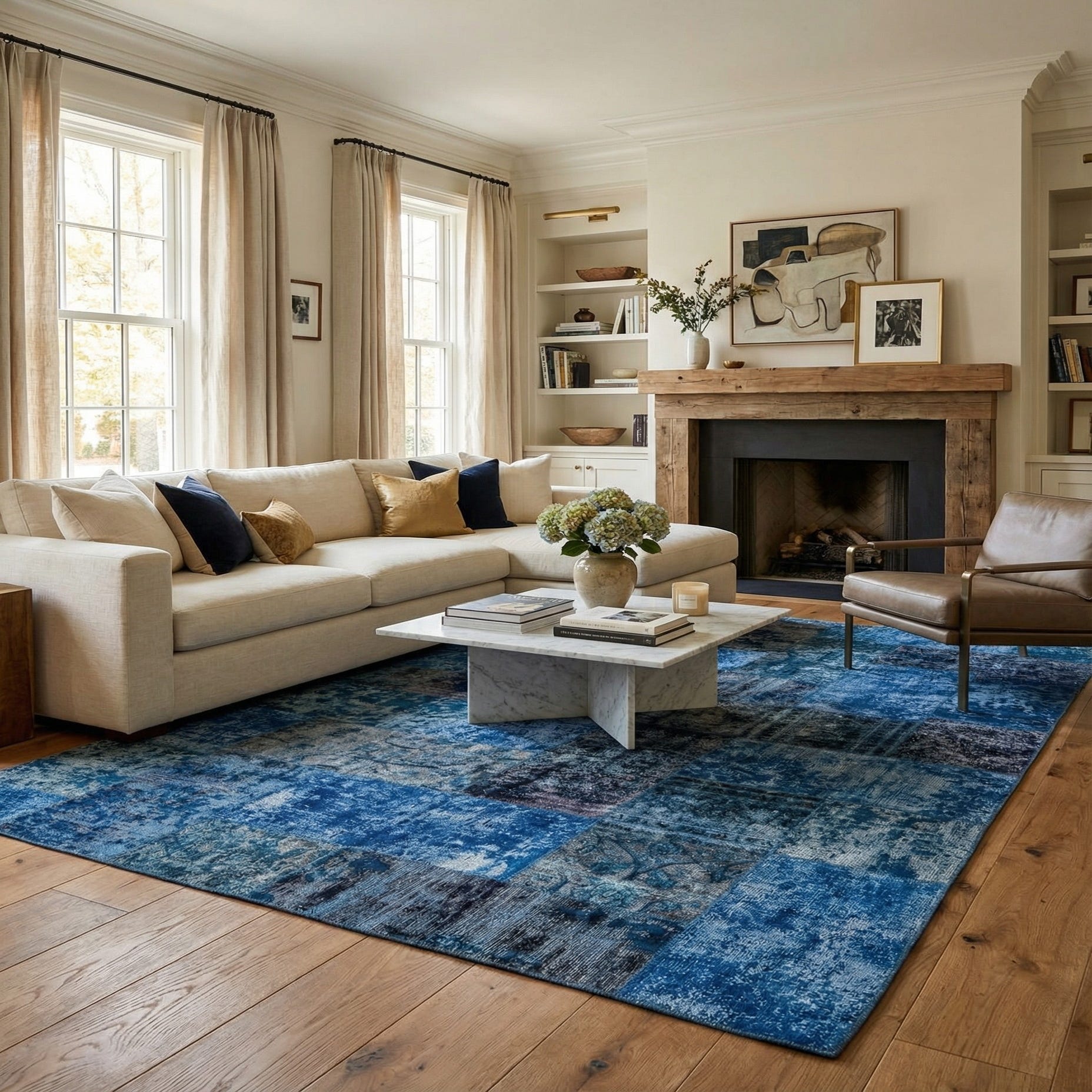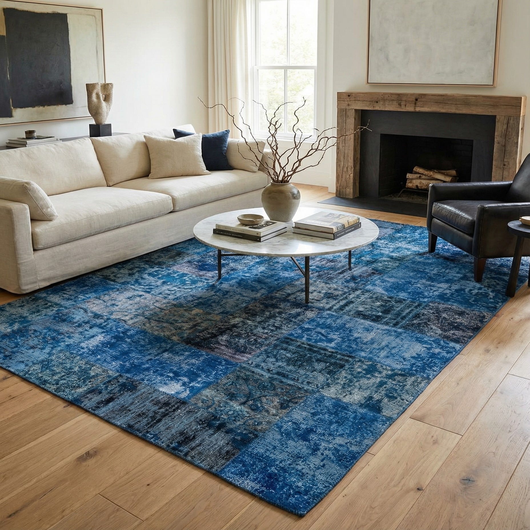 Primary color is Blue. Colors in this rug include: Blue, Navy Blue, Light Blue, Ivory.