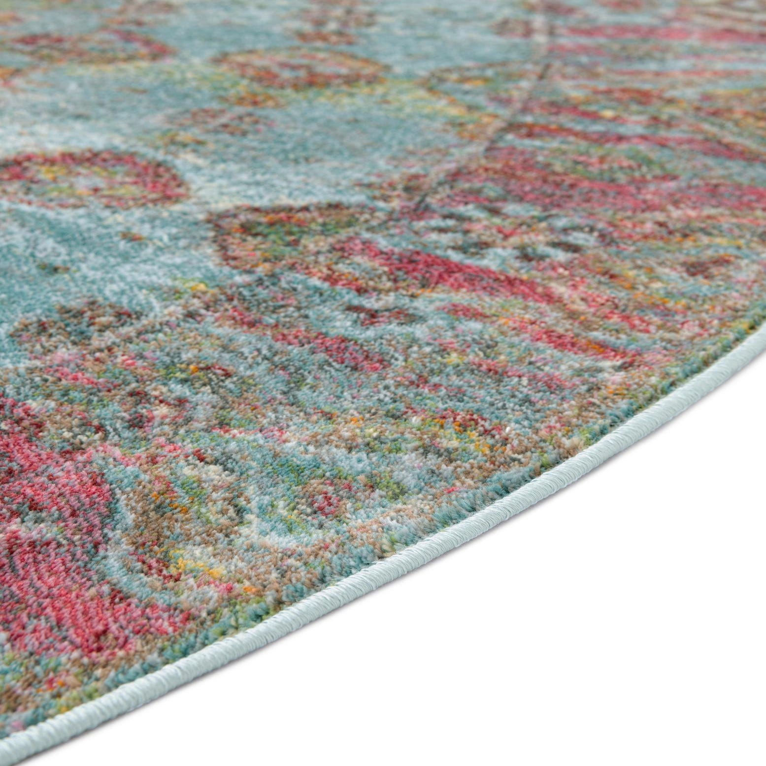Primary color is Blue. Colors in this rug include: Blue, Ivory, Red, Turquoise, Pink, Yellow.