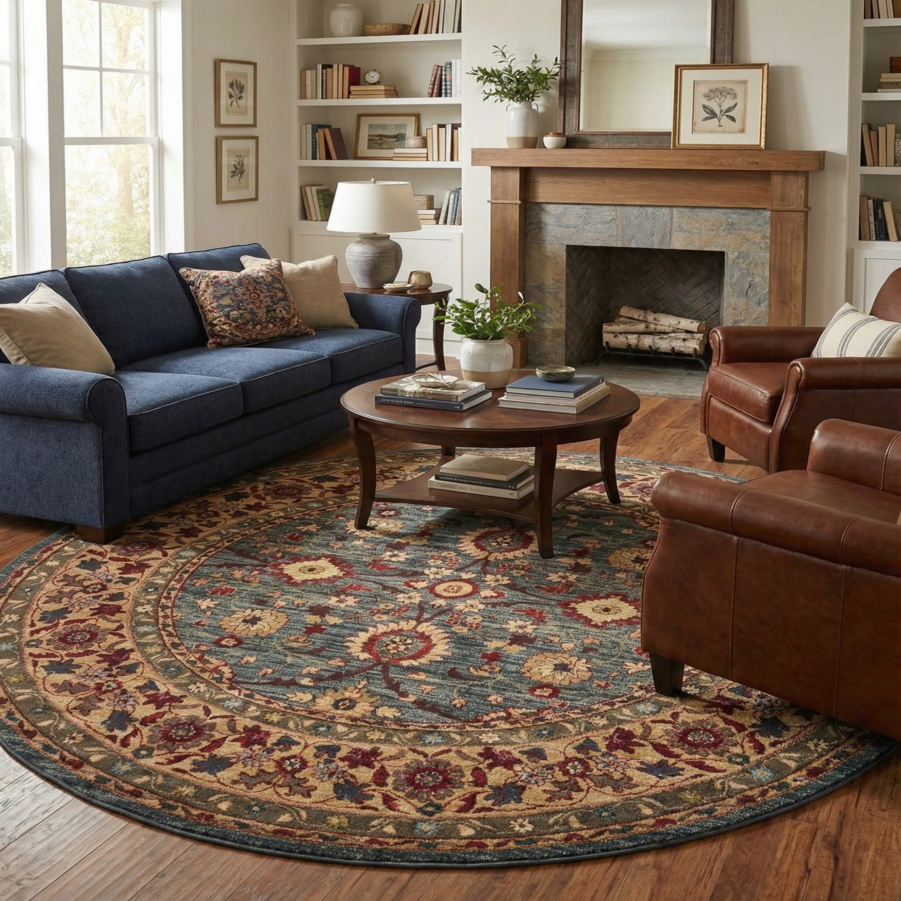 Primary color is Blue. Colors in this rug include: Blue, Beige, Brown, Cream, Light Blue, Olive, Red.