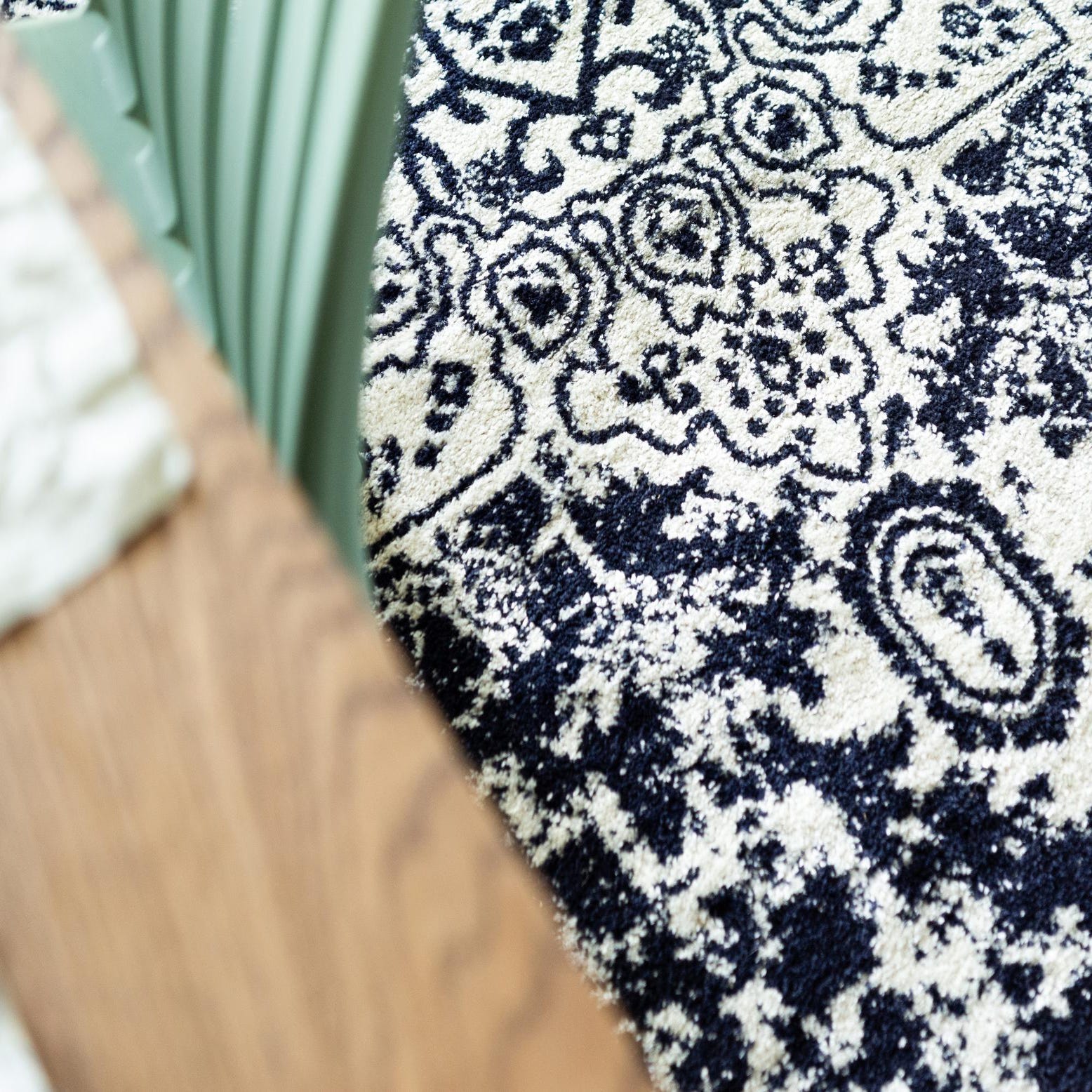Primary color is Blue. Colors in this rug include: Blue, Ivory.