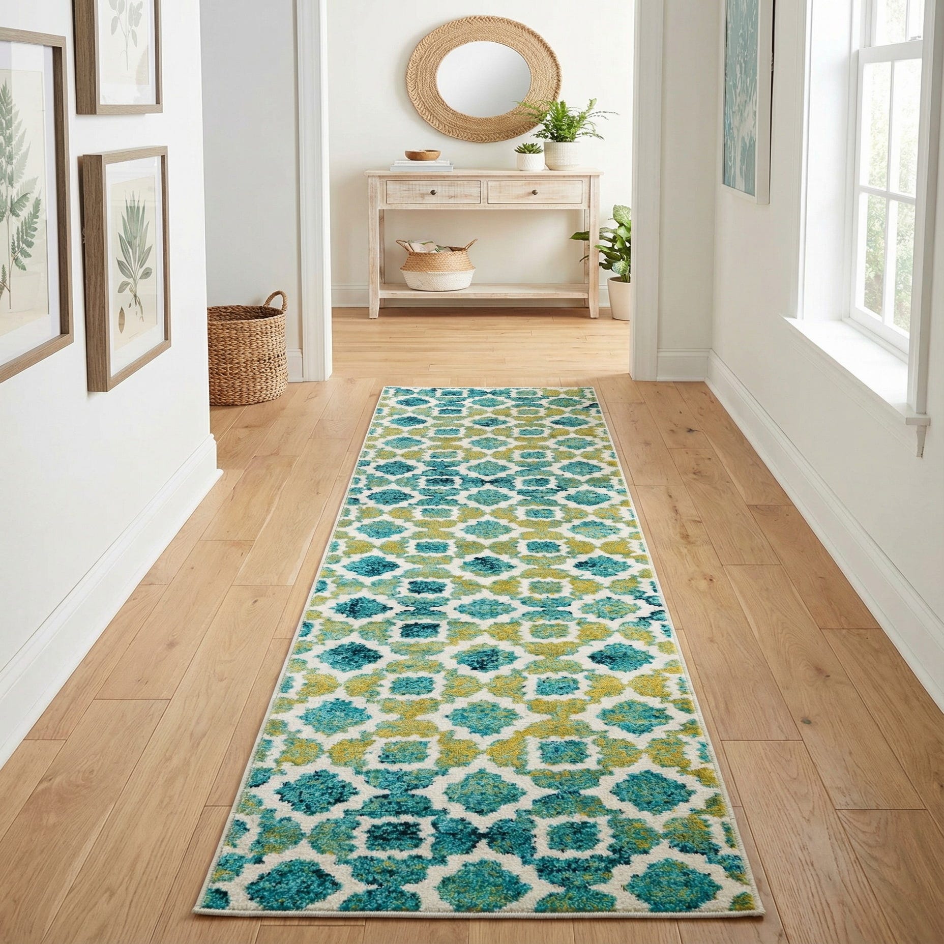 Primary color is Blue. Colors in this rug include: Blue, Ivory, Green, Navy Blue.