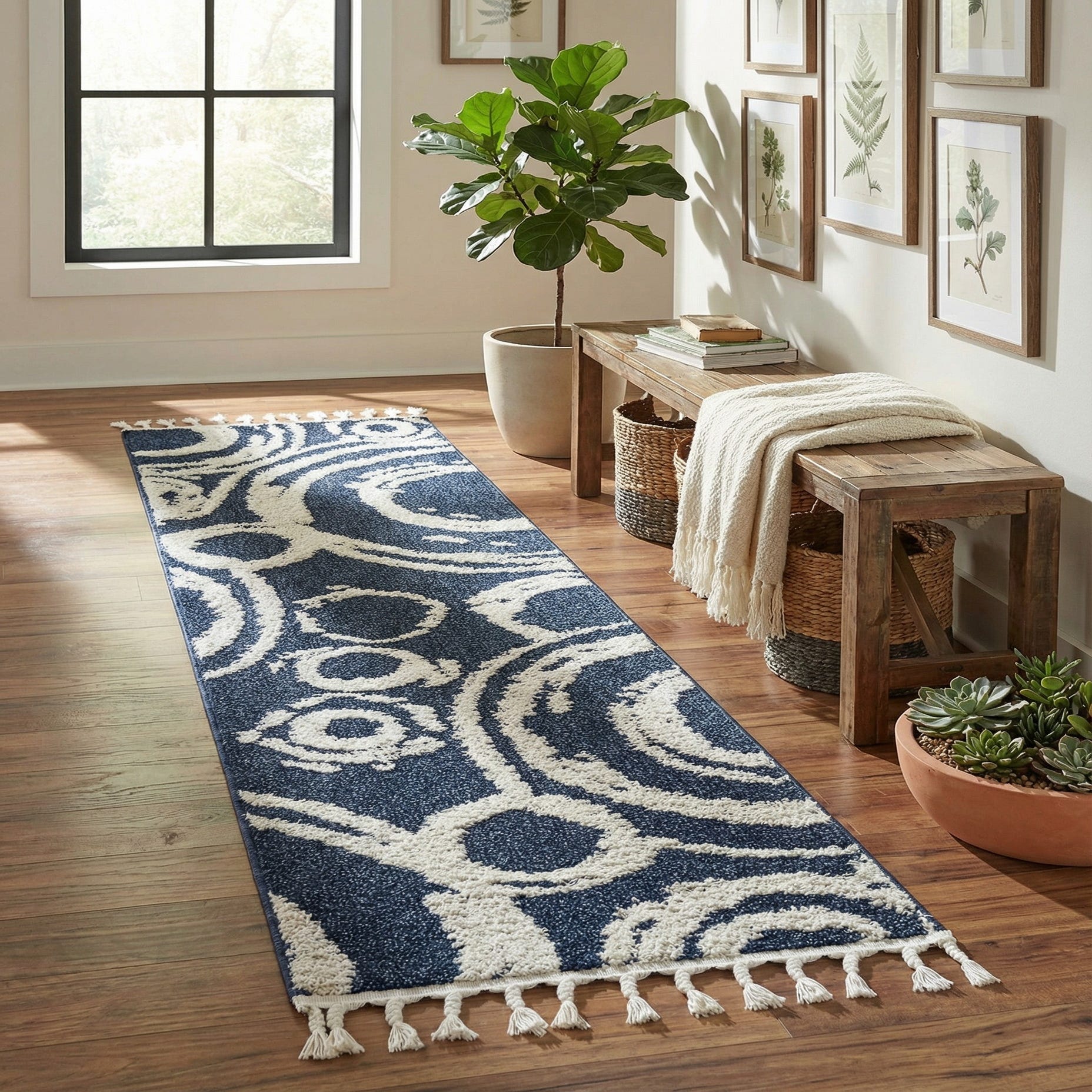 Primary color is Blue. Colors in this rug include: Blue, Ivory.