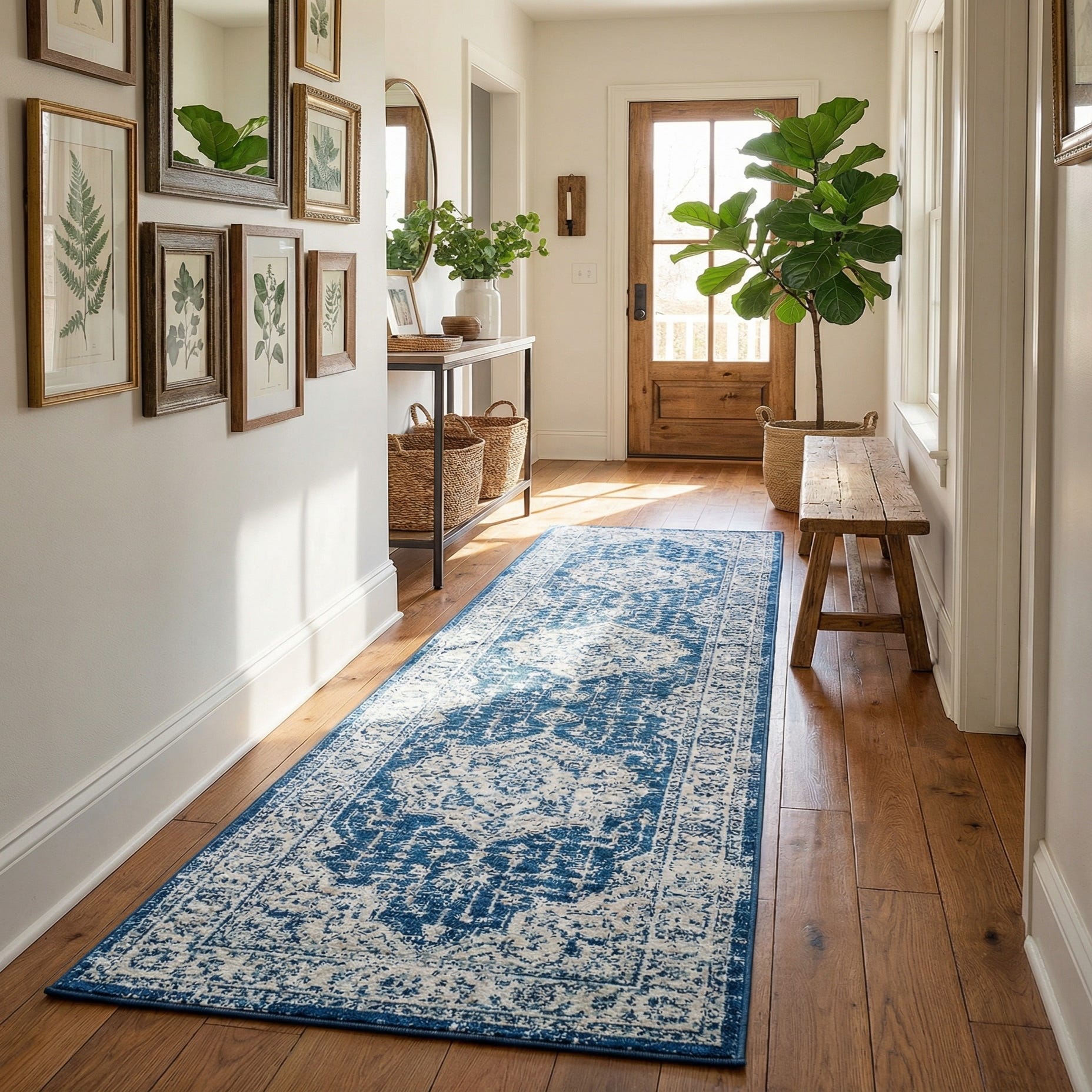 Primary color is Blue. Colors in this rug include: Blue, Ivory.