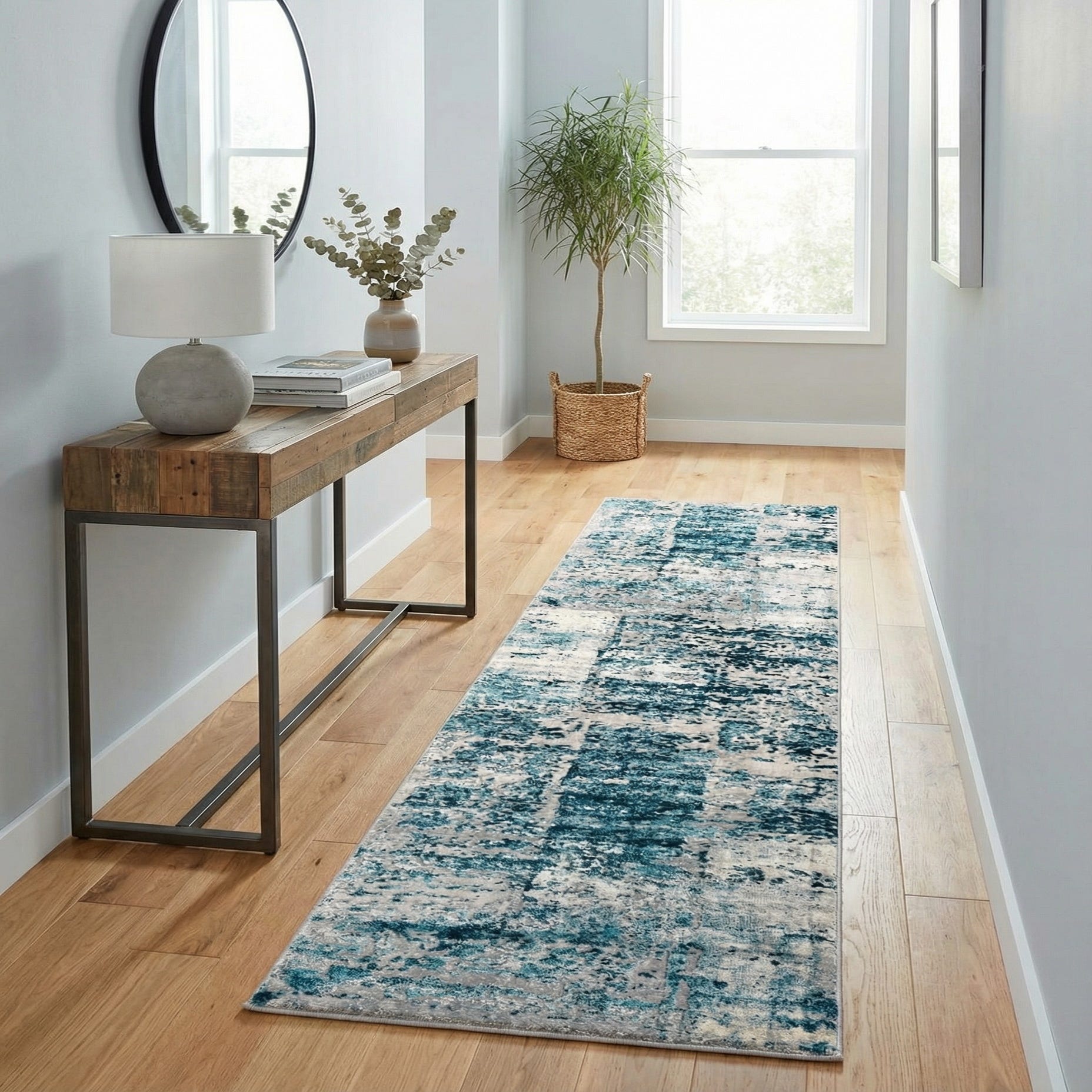 Primary color is Blue. Colors in this rug include: Blue, Ivory, Gray, Light Blue.