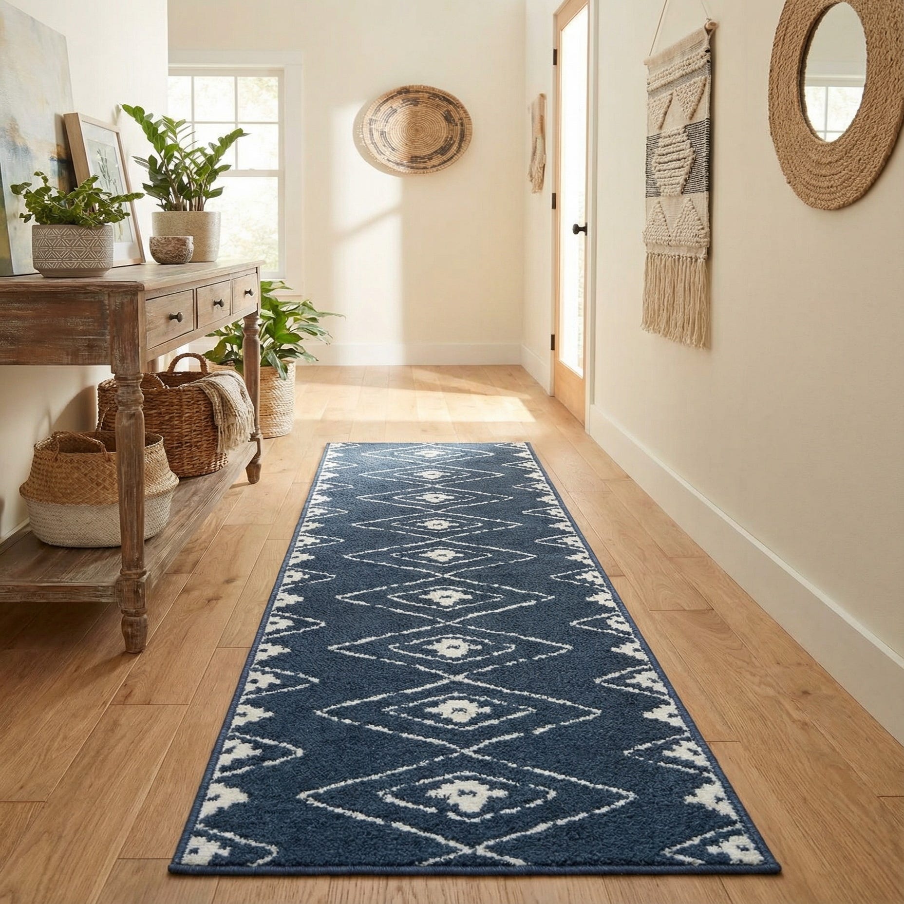 Primary color is Blue. Colors in this rug include: Blue, Ivory.