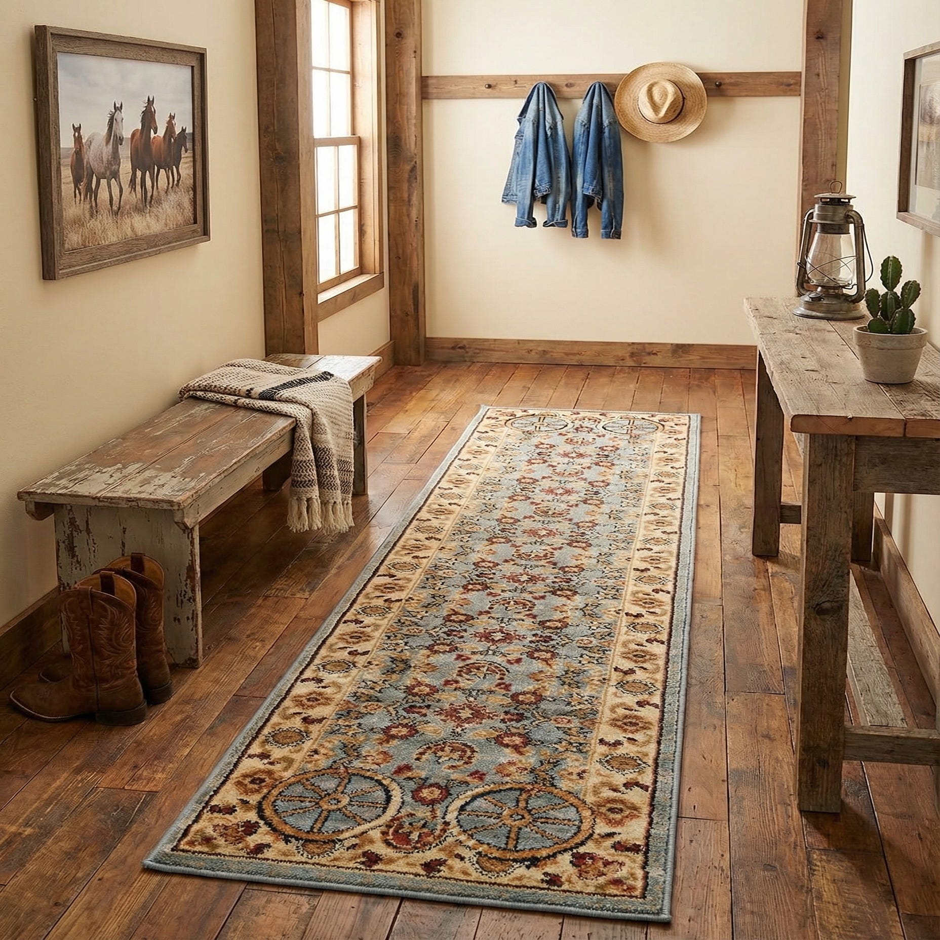 Primary color is Blue. Colors in this rug include: Blue, Beige, Black, Brown, Rust Red.