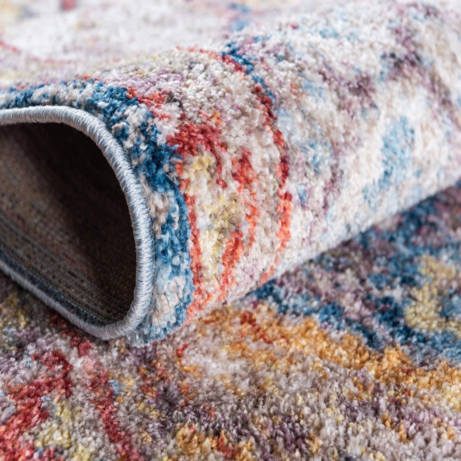 Primary color is Blue. Colors in this rug include: Blue, Beige, Gold, Gray, Ivory, Navy Blue, Orange, Red, Yellow, Pink.