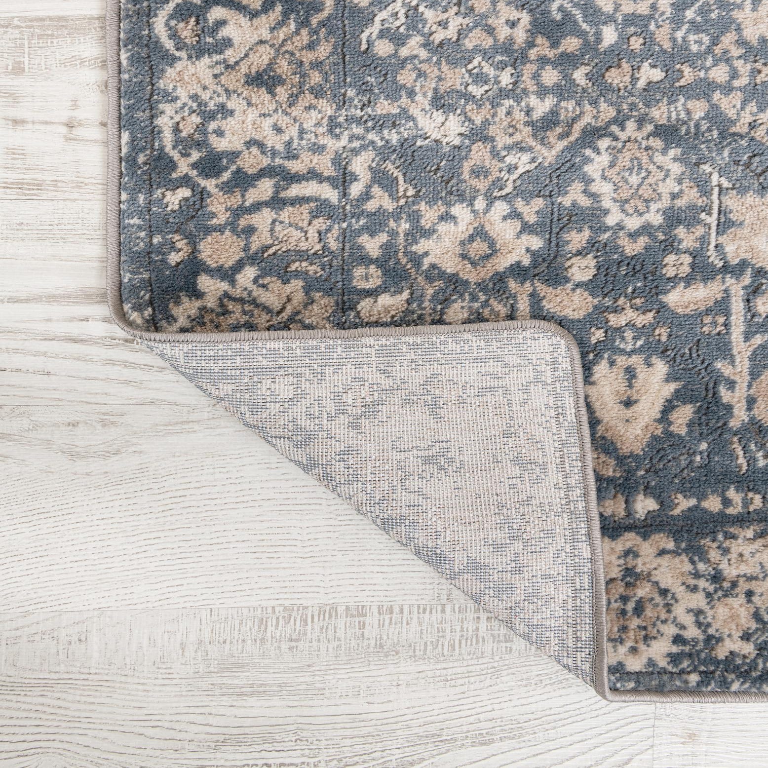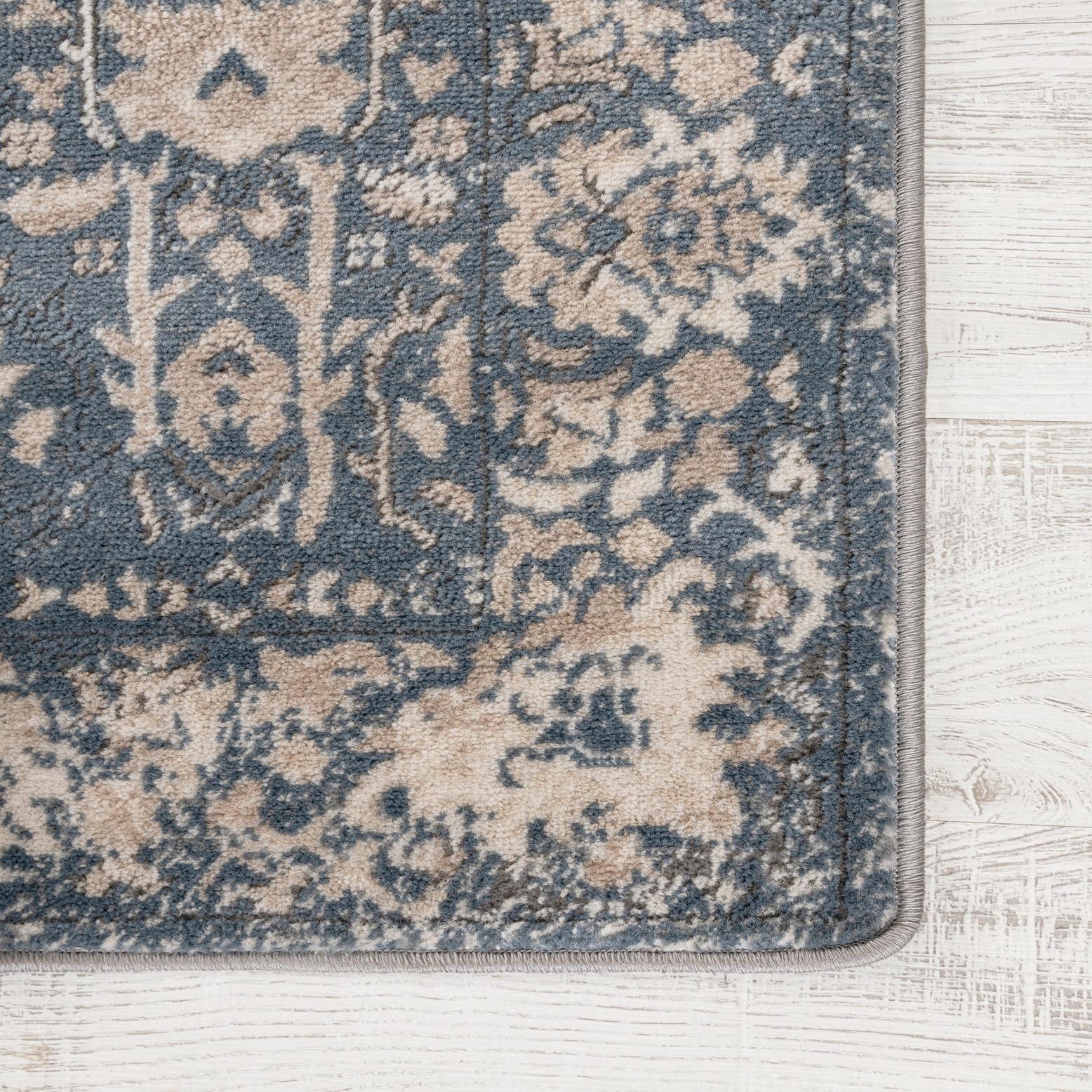 Primary color is Blue. Colors in this rug include: Blue, Beige, Ivory, Light Brown.