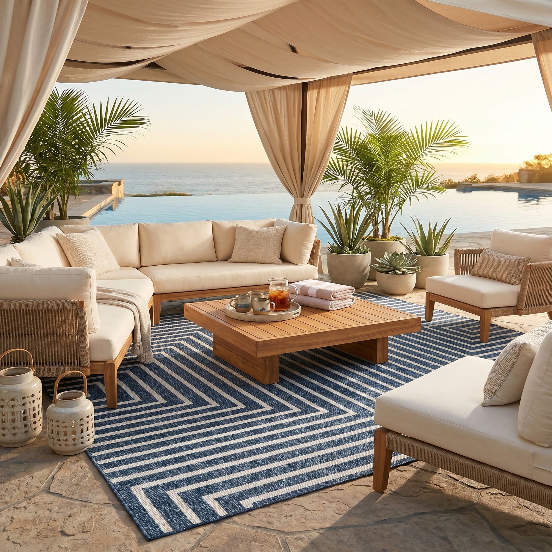 Love the contemporary look of this rug! We are so happy we chose this to accent the blue of our pool with our living area on our lanai. We still are going to add a few more pillows but love the rug to add color.