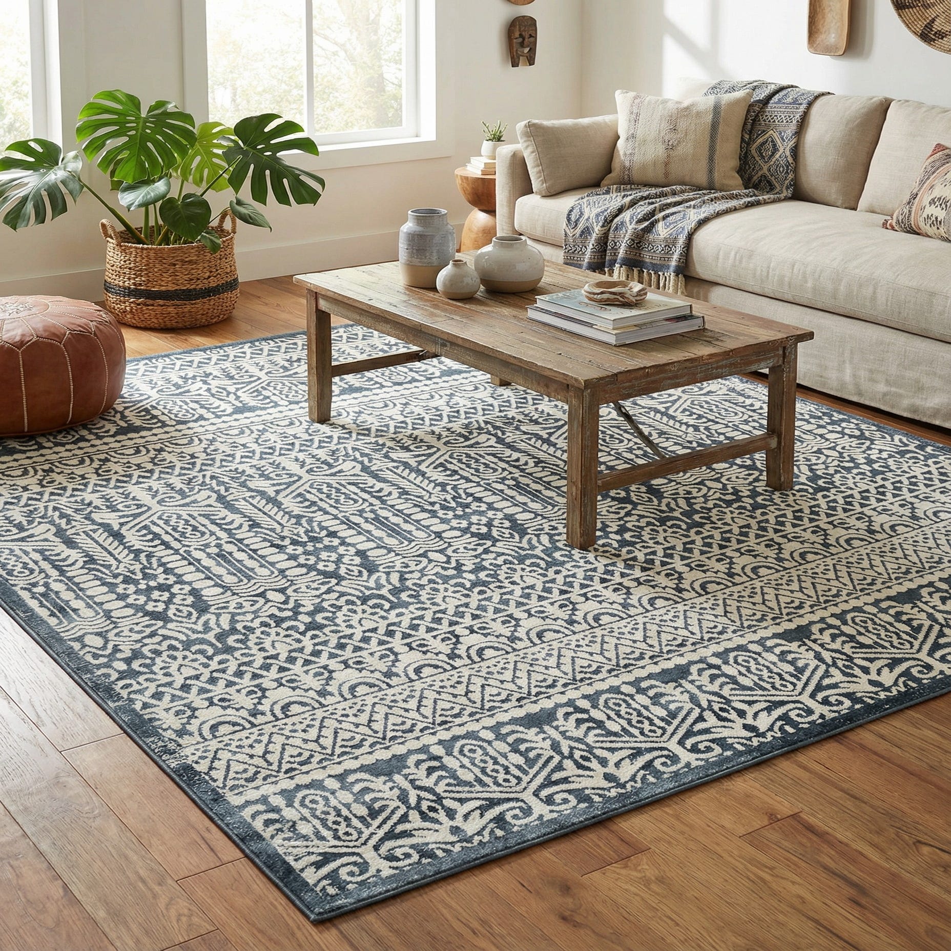 Primary color is Blue. Colors in this rug include: Blue, Ivory.