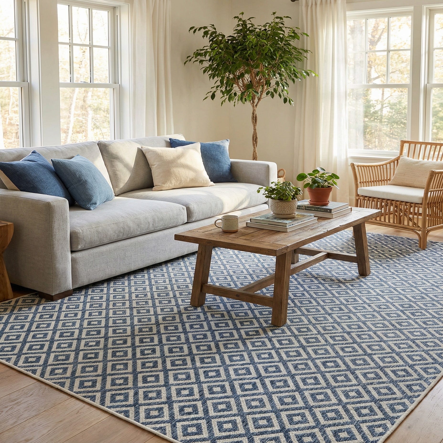 Primary color is Blue. Colors in this rug include: Blue, Ivory.