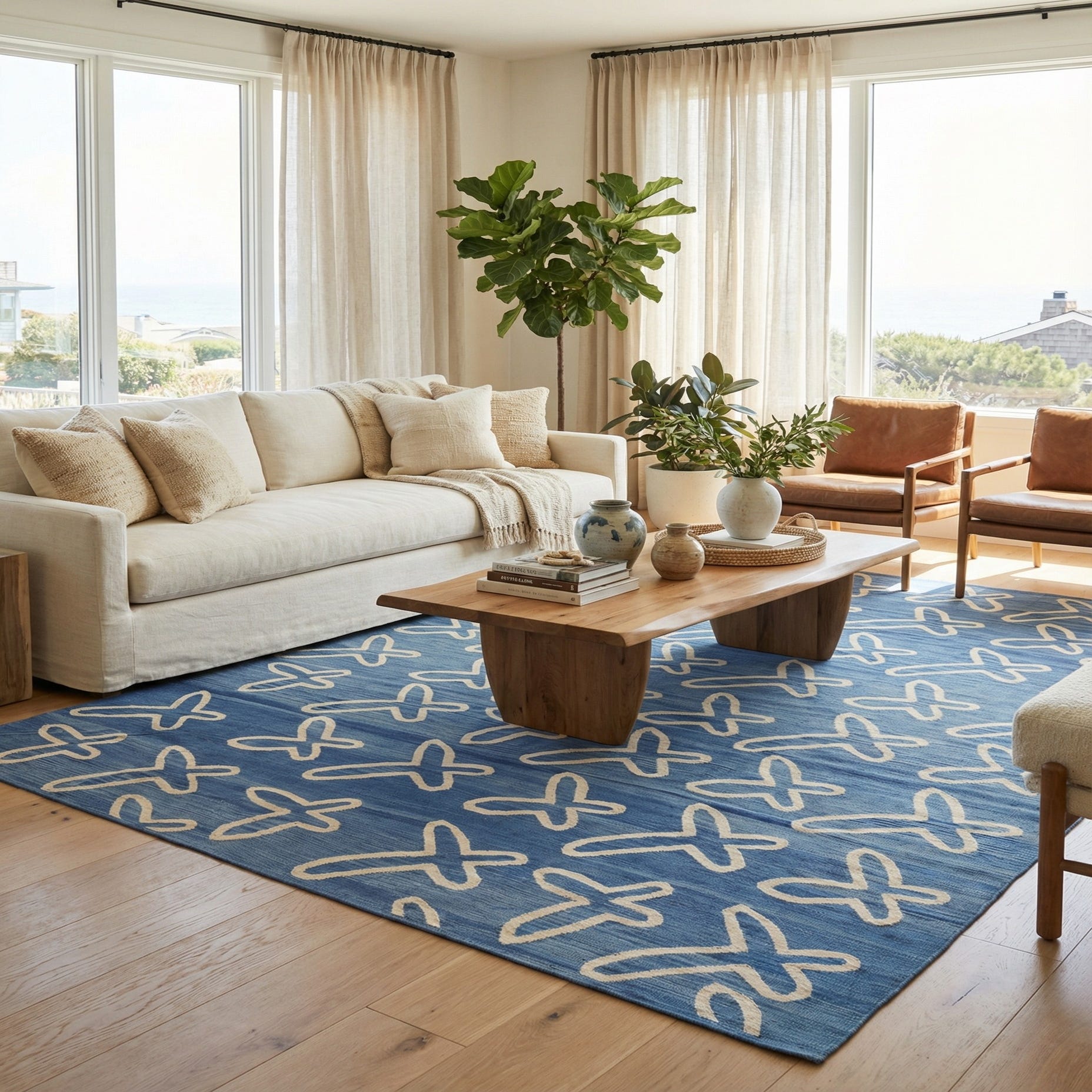 Primary color is Blue. Colors in this rug include: Blue, Ivory.