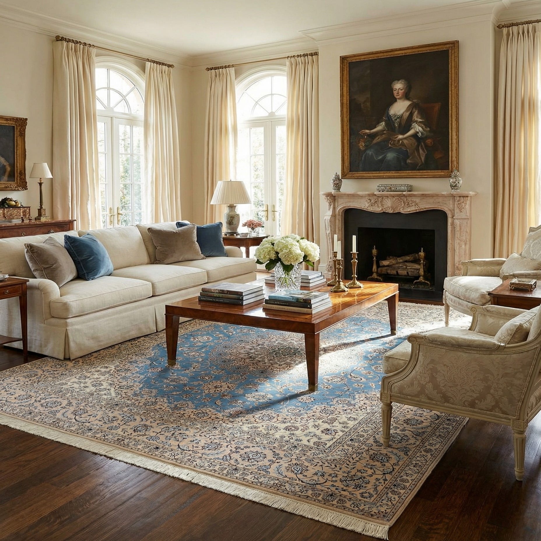 Primary color is Blue. Colors in this rug include: Blue, Beige.